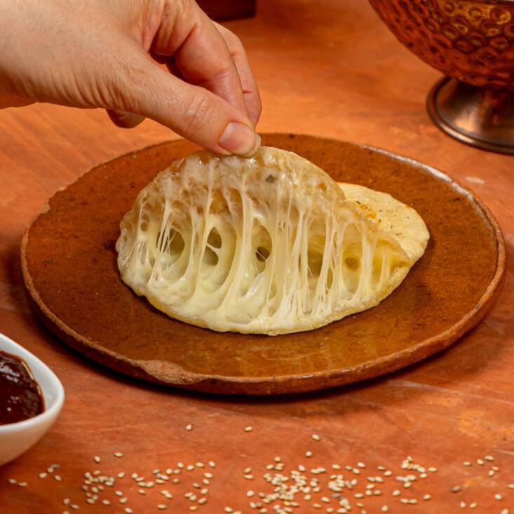 Pan árabe pequeño relleno de queso manchego gratinado, espolvoreado con Zaatar (deliciosa mezcla de especias árabes) y acompañado con salsa árabe.