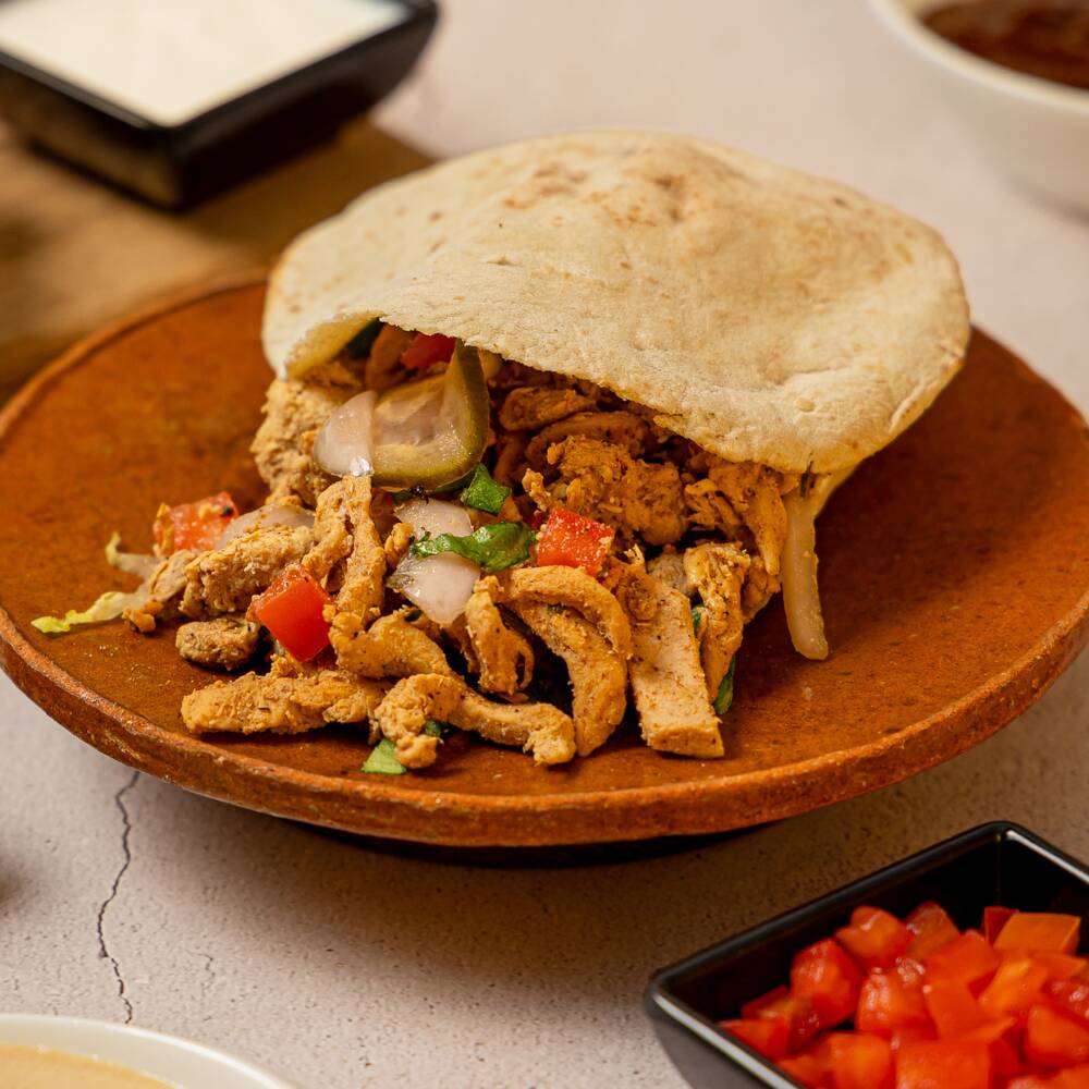 Pan árabe chico relleno de 120 grs de nuestro pollo preparado y acompañado de jocoque, salsa árabe, pepinillos,, salsa de tahini, lechuga y jitomate.
