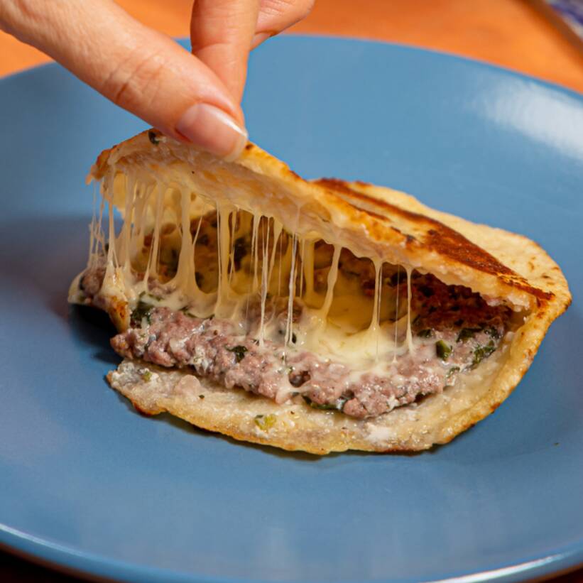 Pan árabe pequeño relleno de queso manchego gratinado y 80 grs de Kafta (carne de res preparada), acompañado de salsa árabe.