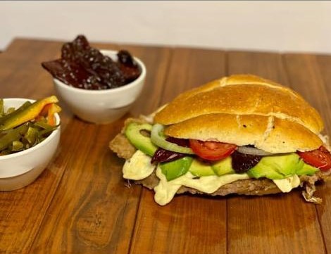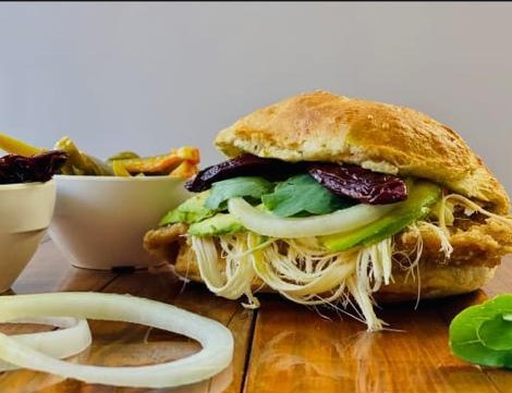 milanesa de pollo quesillo cebolla picante aguacate y papalo