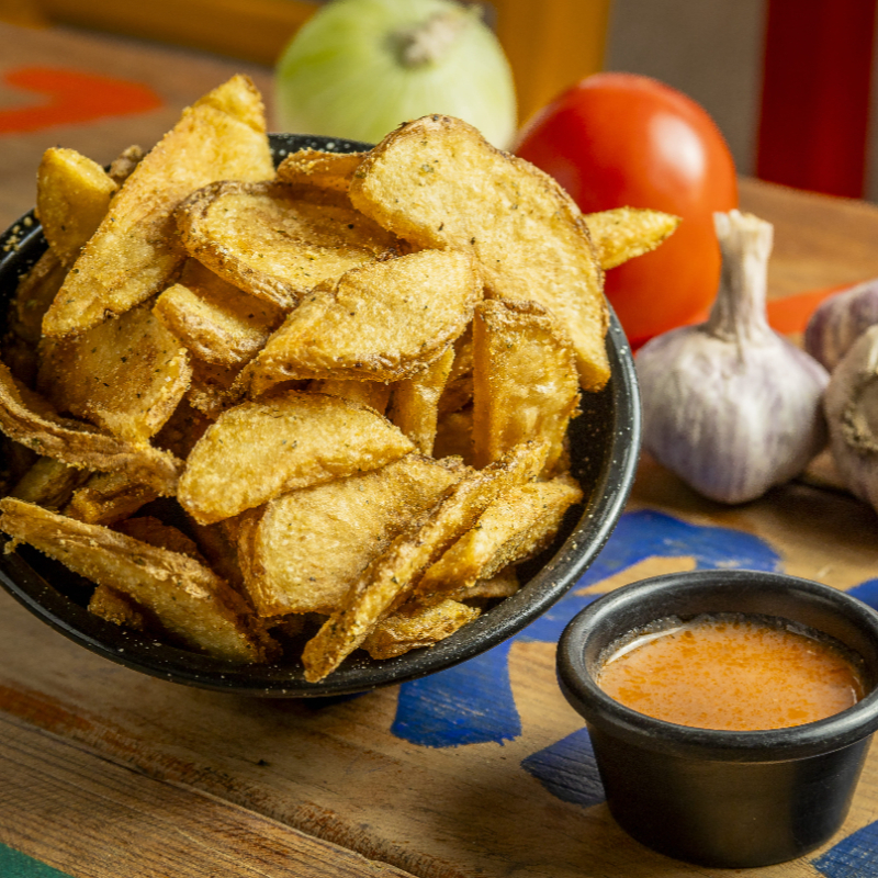 Sazonadas con chile de árbol tostado, sal y pimienta negra, acompañadas con aderezo chipotle