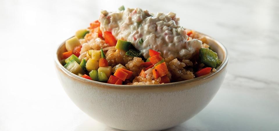 Variedad de verduras a la plancha con cama de arroz importado y salsa teriyaki.