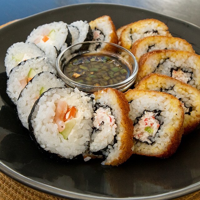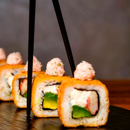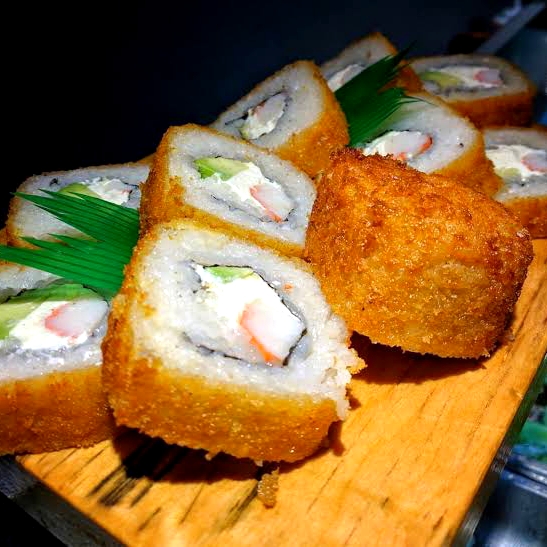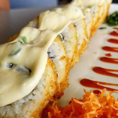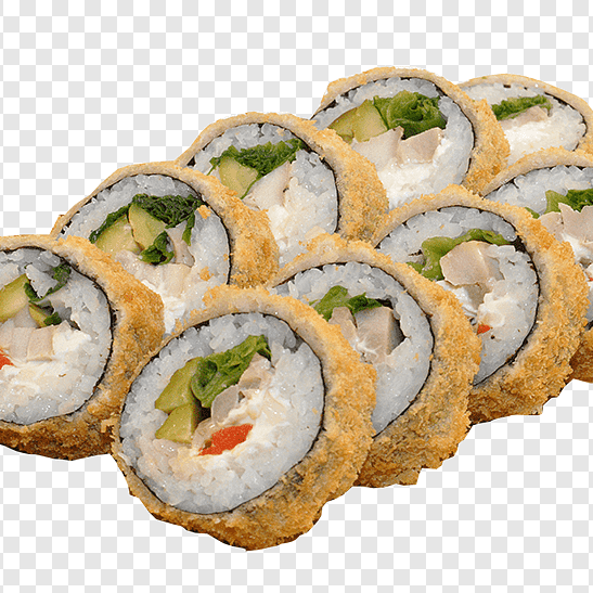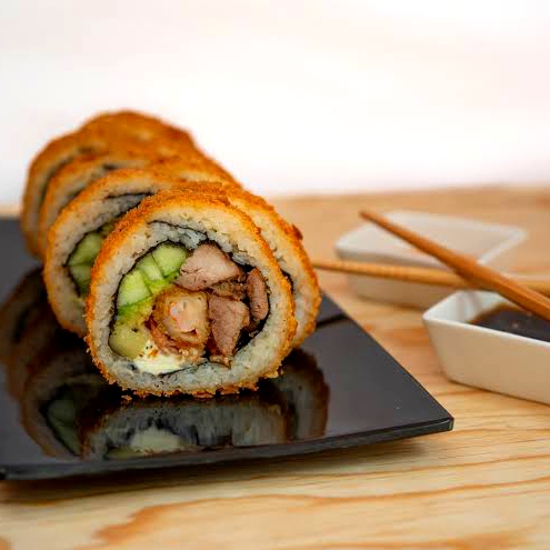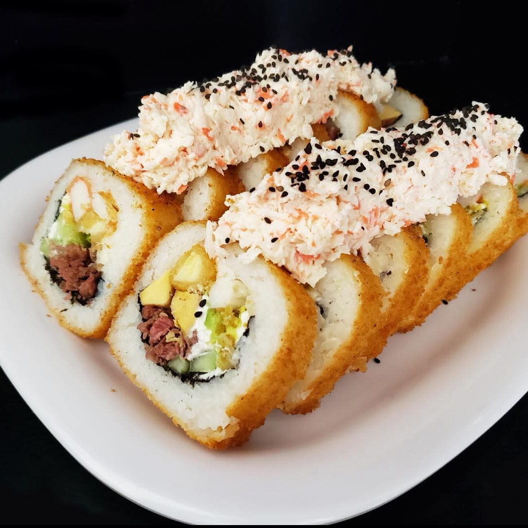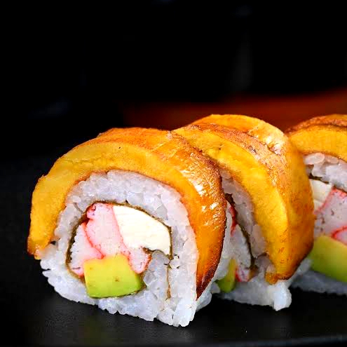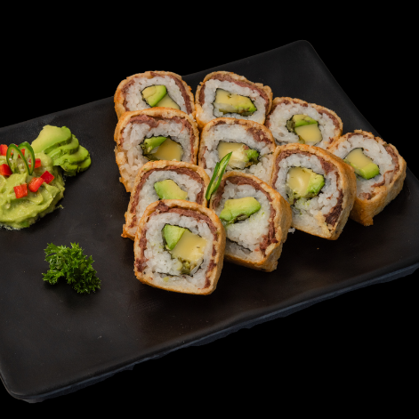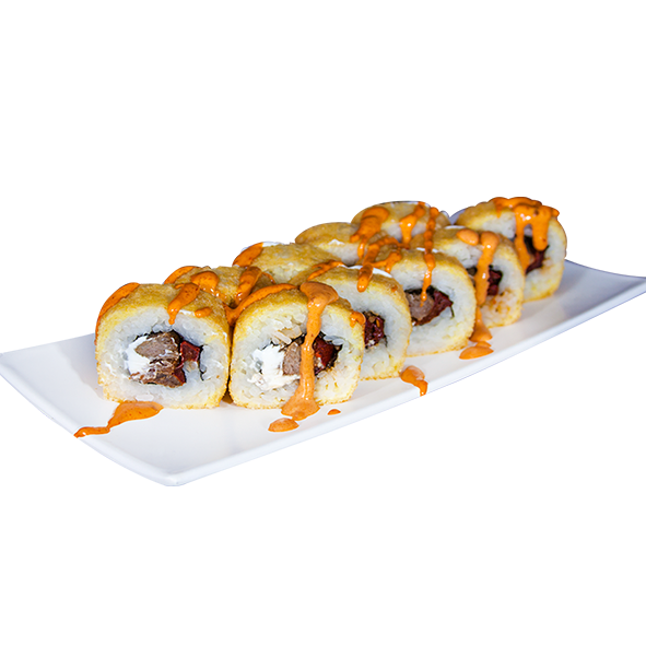 10 pzas Relleno de queso crema, pepino, surimi, afuera plátano frito, ajonjolí y salsa de anguila.