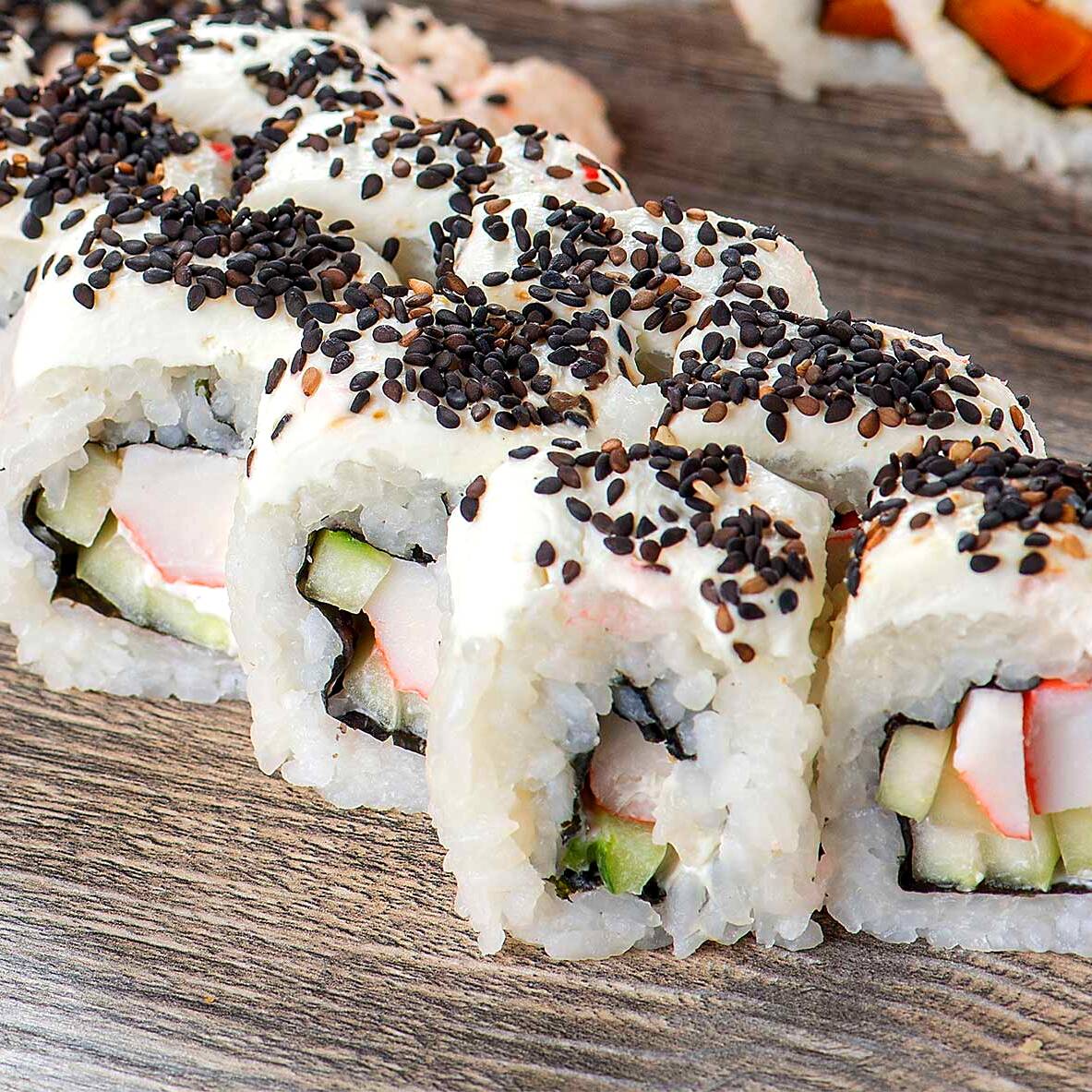 10 pzas Relleno de queso crema, pepino, surimi, afuera ajonjolí negro tostado.