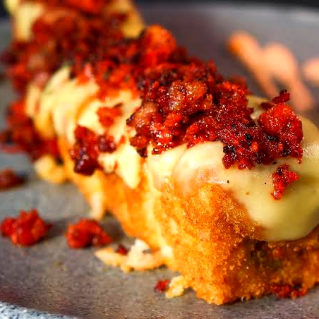 Relleno de queso crema, arrachera, chipotle y afuera empanizado con Doritos