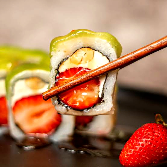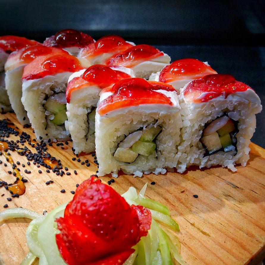 10 pzas Relleno de queso crema, pepino, surimi, afuera fresas y mermelada de fresa.