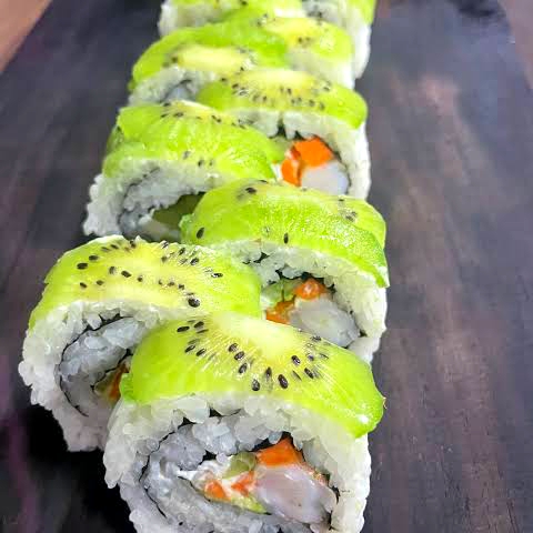 10 pzas Relleno de queso crema, pepino, surimi, ajonjolí dulce y negro, afuera kiwi
