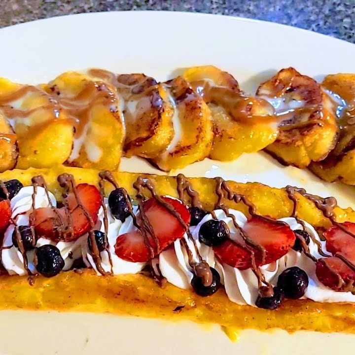 Plátano abierto, relleno de queso crema, fresas, y lechera o chocolate