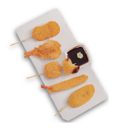 3 kushiges de queso manchego y 3 kushiges de Camarón, con aderezo de chipotle y tartara