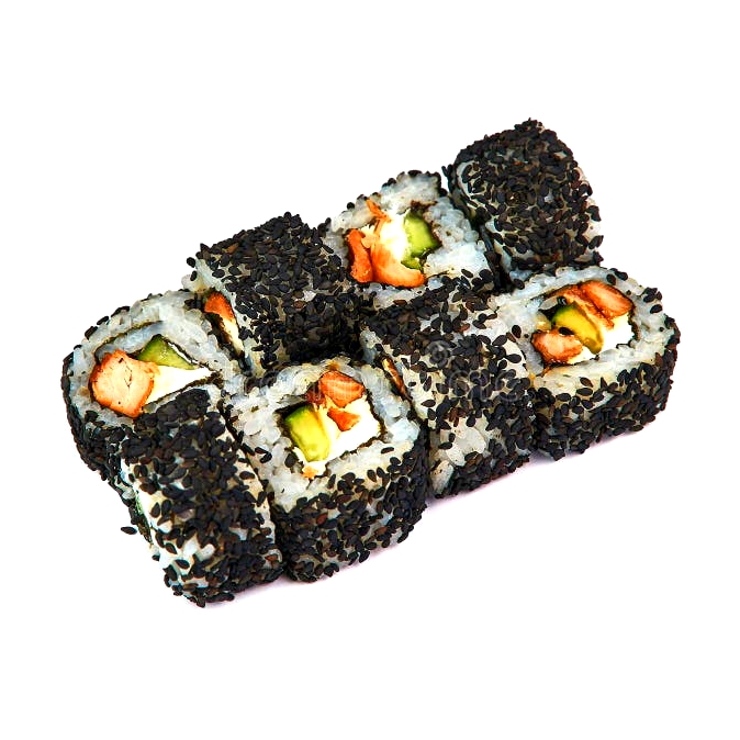 10 pzas Relleno de queso crema, pepino, camarones, afuera extra queso crema y ajonjolí negro.