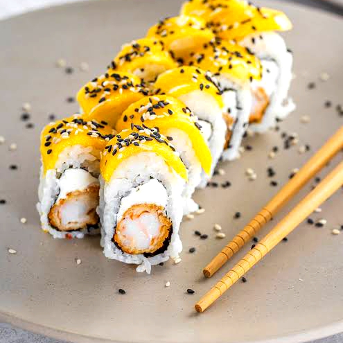 10 pzas Relleno de queso crema, surimi empanizado, afuera mango fileteado, y ajonjolí negro