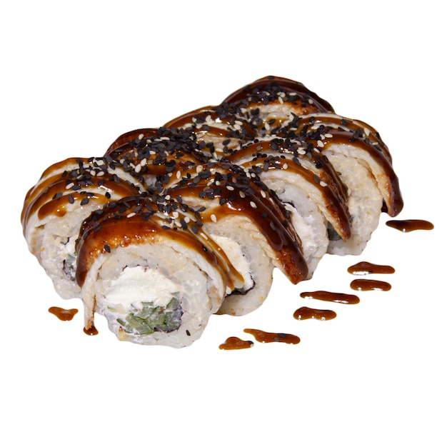 10 pzas Relleno de queso crema, camarones empanizados, pepino, afuera extra queso crema, salsa de anguila y ajonjolí negro.