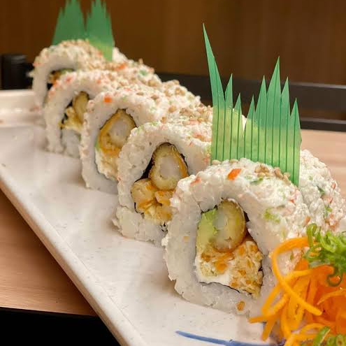 10 pzas Relleno de queso crema, pepino, surimi, afuera bañado en temperatura frito y salsa de anguila con ajonjolí negro