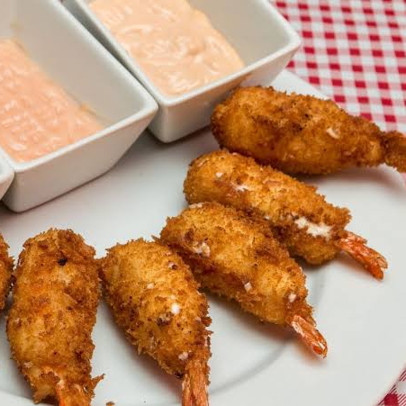6 camarones empanizados con aderezo de chipotle,