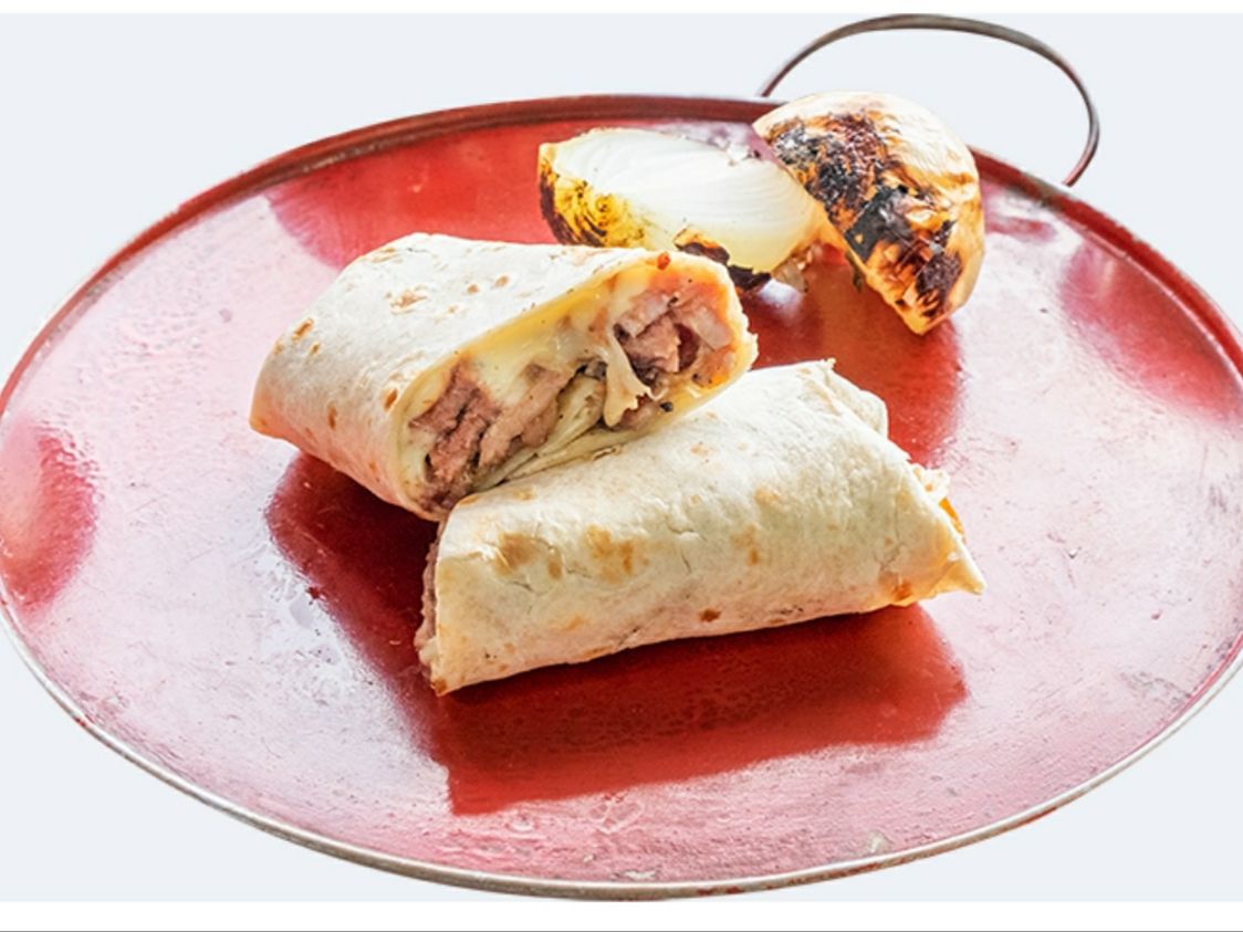 tortilla de harina wrap con frijoes, queso y carne de tu eleccion, cebolla, cilantro y guacamole