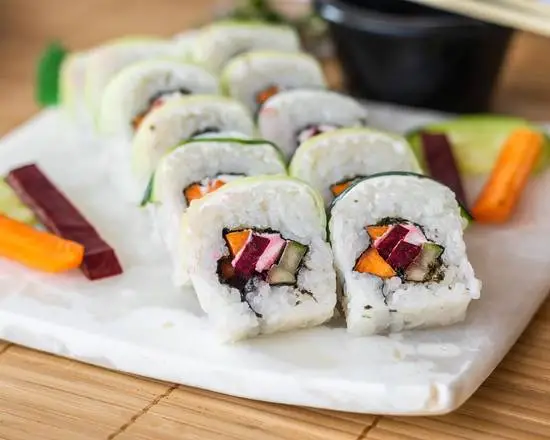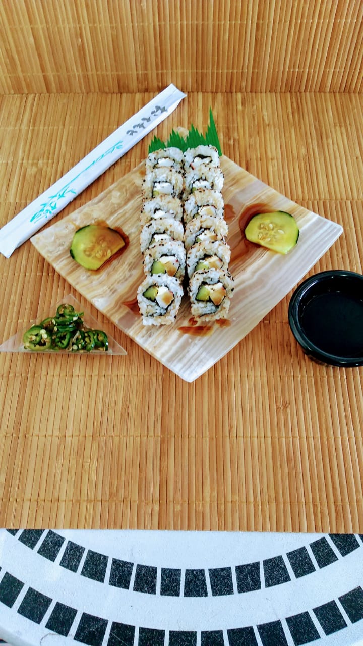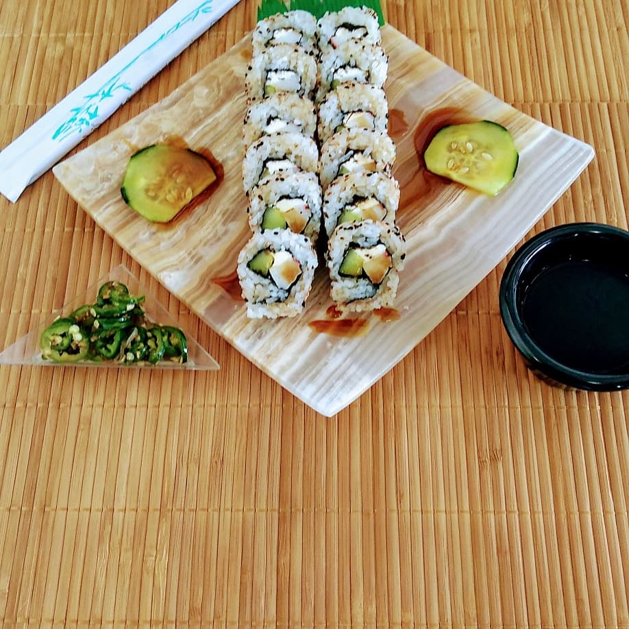 Cubierto de hoja de pepino relleno de queso crema, surimi, pepino y aguacate con un toque de sésamo y salsa de anguila.