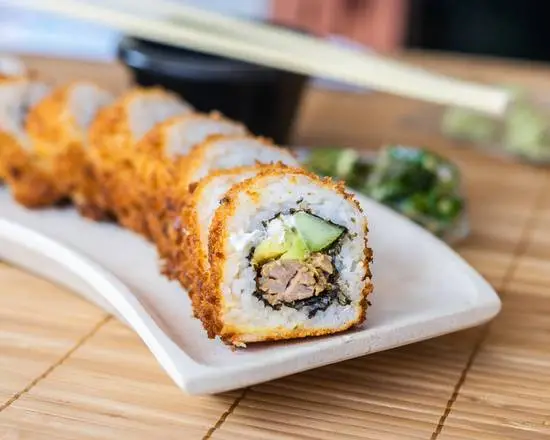 Empanizados relleno de atún enchipotlado, aguacate, queso crema, pepino. Abrazado de queso gouda.