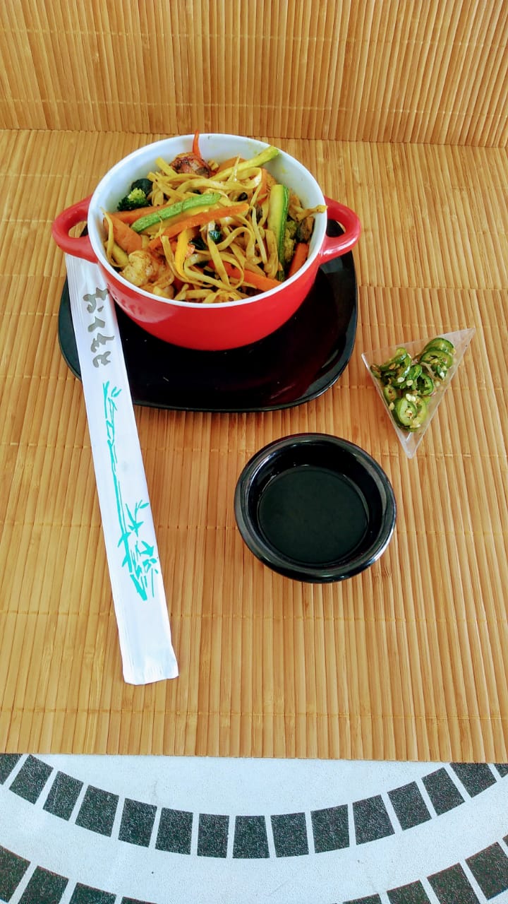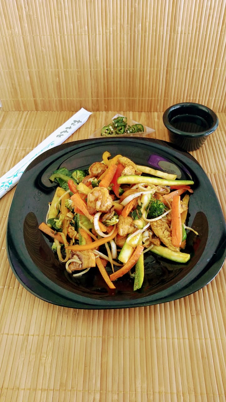 Pasta udon con verduras salteadas con camarón sazonado con soya y teriyaki.