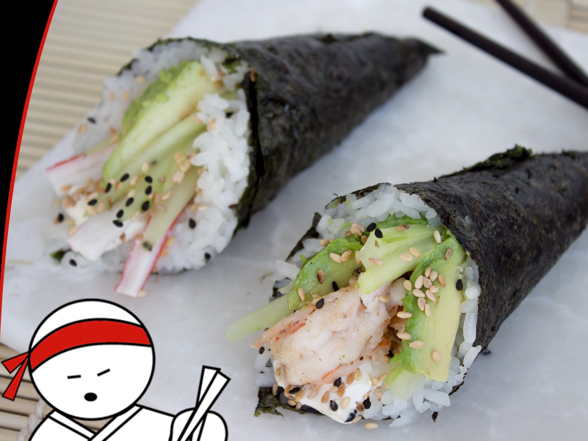Abrazado con ajonjolí relleno de surimi, pepino, aguacate y queso philadelphia.