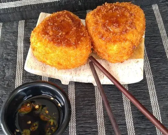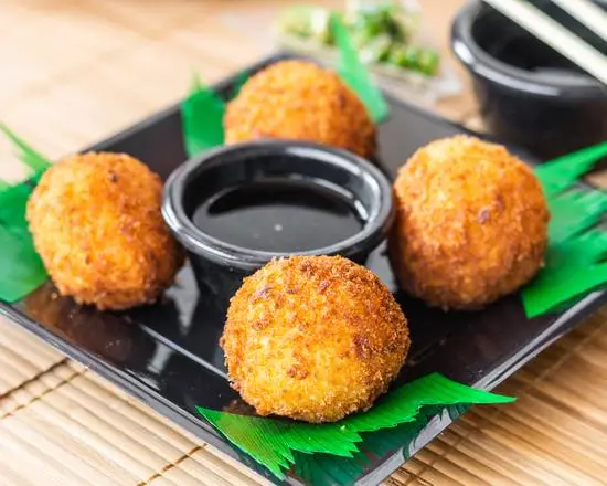 Esferas de arroz empanizadas, rellenas de arrachera y queso crema. Con un sombrero de queso gouda.