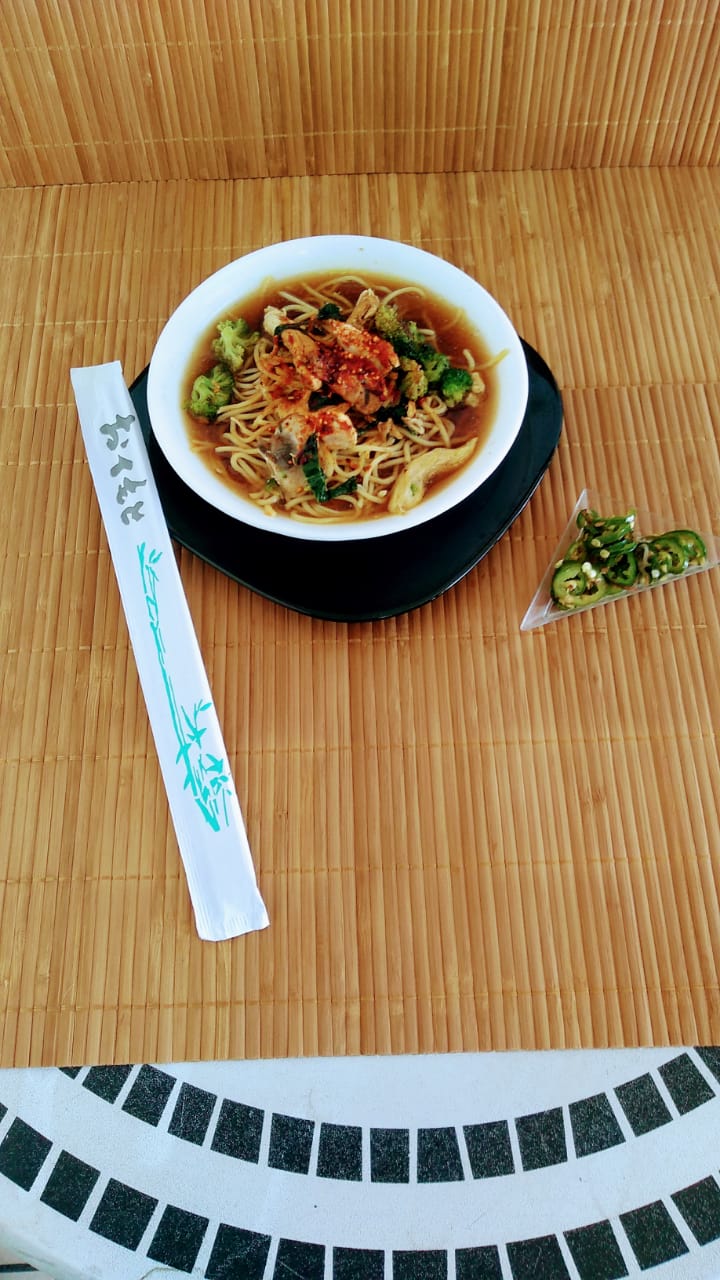 Bowl ramen, pollo, brócoli, champiñón, morrón, germen de soya, espinacas.