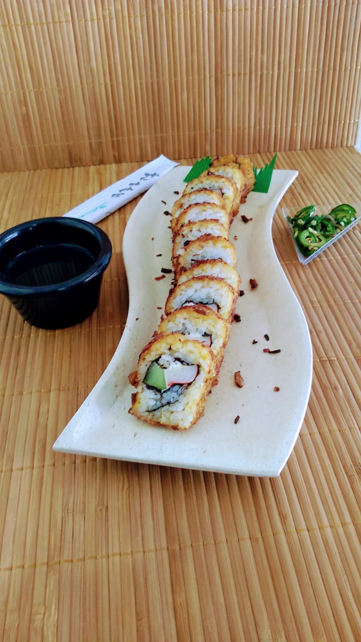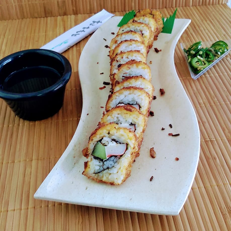 Empanizado relleno de camarón, queso crema, pepino, aguacate y salsa macha.