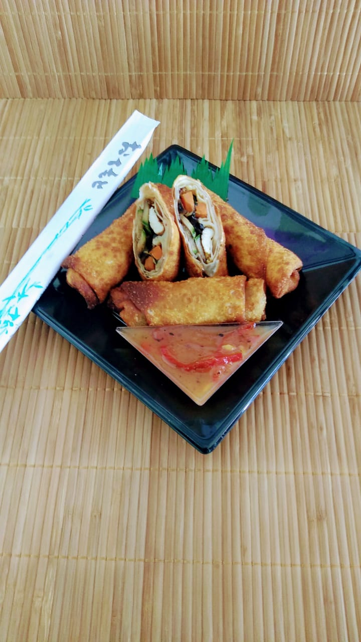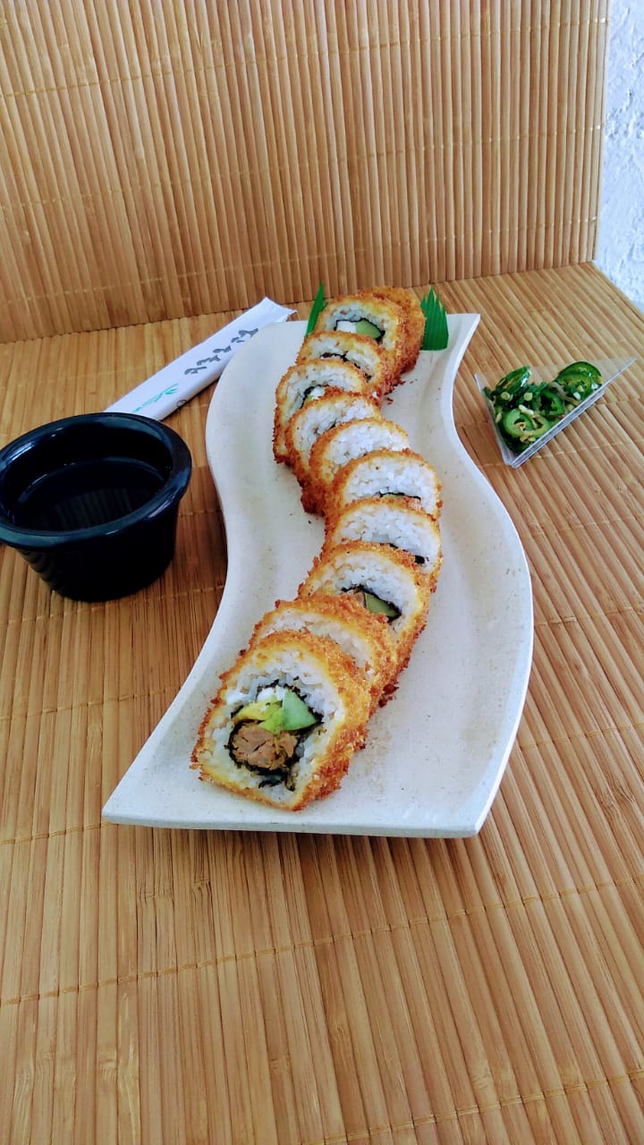 Empanizado relleno de surimi, pepino, queso crema y y un toque de salsa de anguila