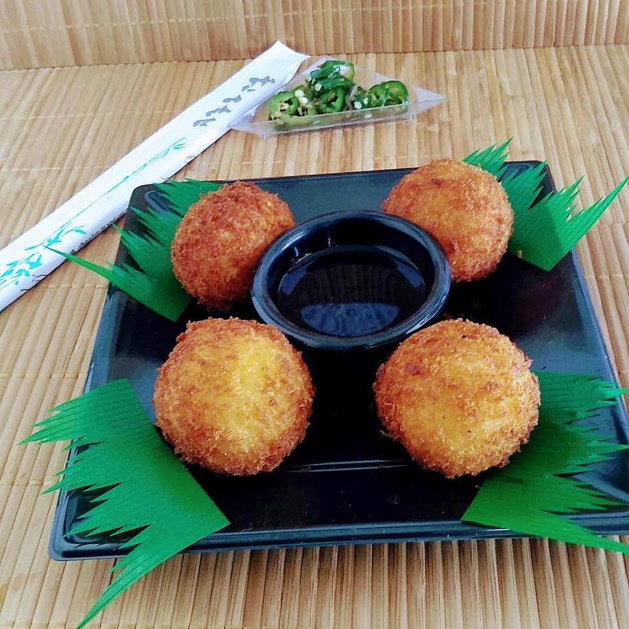 Esferas de arroz empanizadas rellenas de queso Philadelphia.