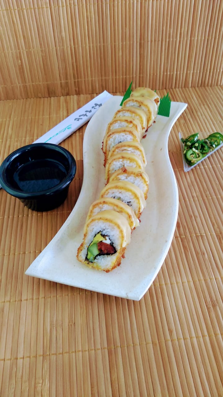Maki relleno de queso crema, pepino, surimi y aguacate. Cubierto de queso crema y un toque de salsa de anguila
