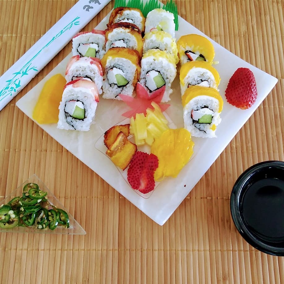 Cubierto y relleno con queso Philadelphia, abrazado de kiwi, fresa, mango, plátano, surimi y pepino.