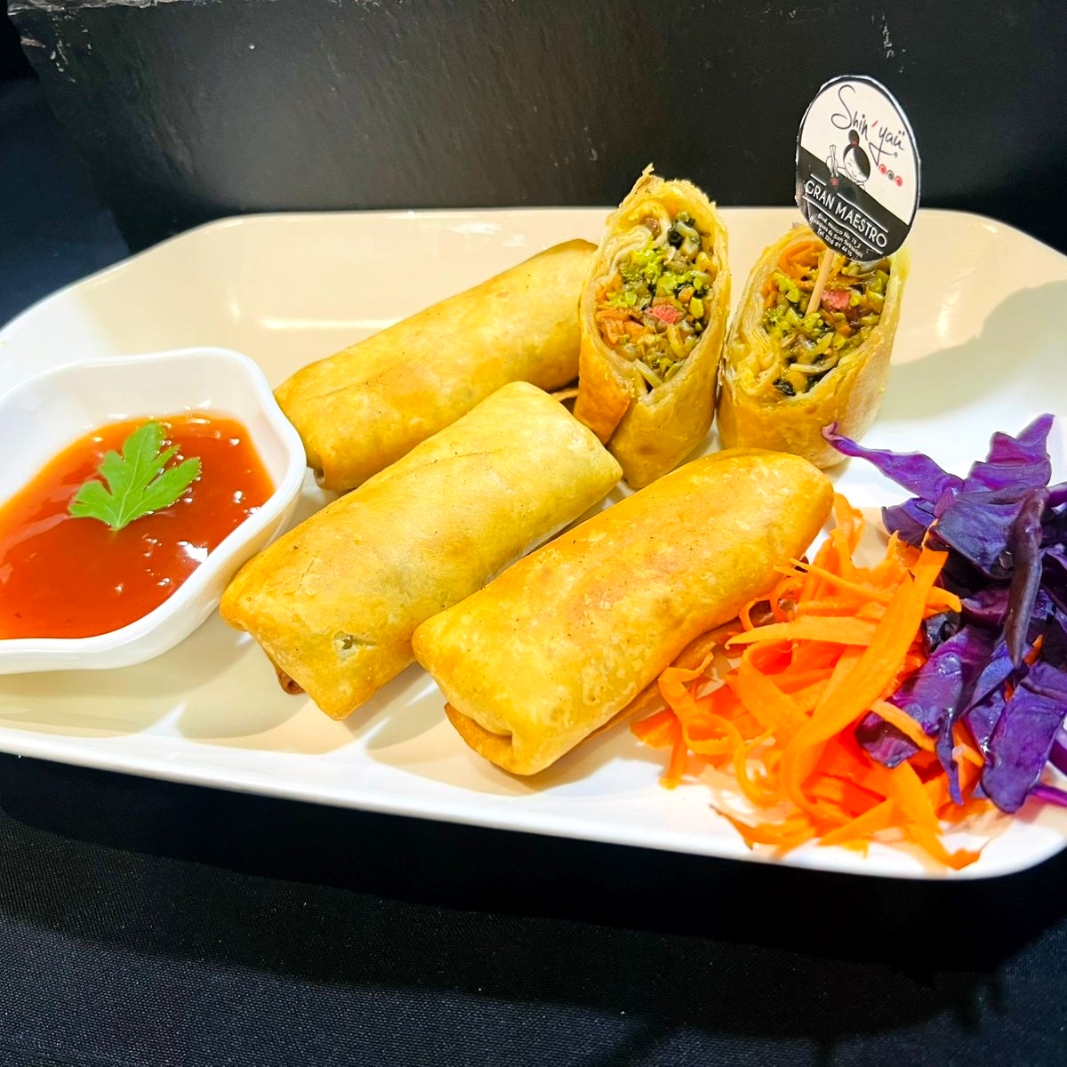 Rollitos rellenos de pollo y chorizo con verduras salteadas en soya y teriyaki.