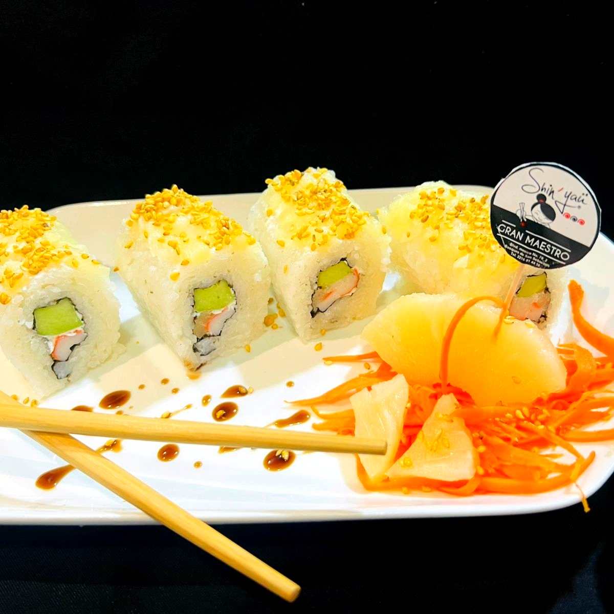 Relleno de masago,aguacate,queso crema, cubierto e queso crema y masago