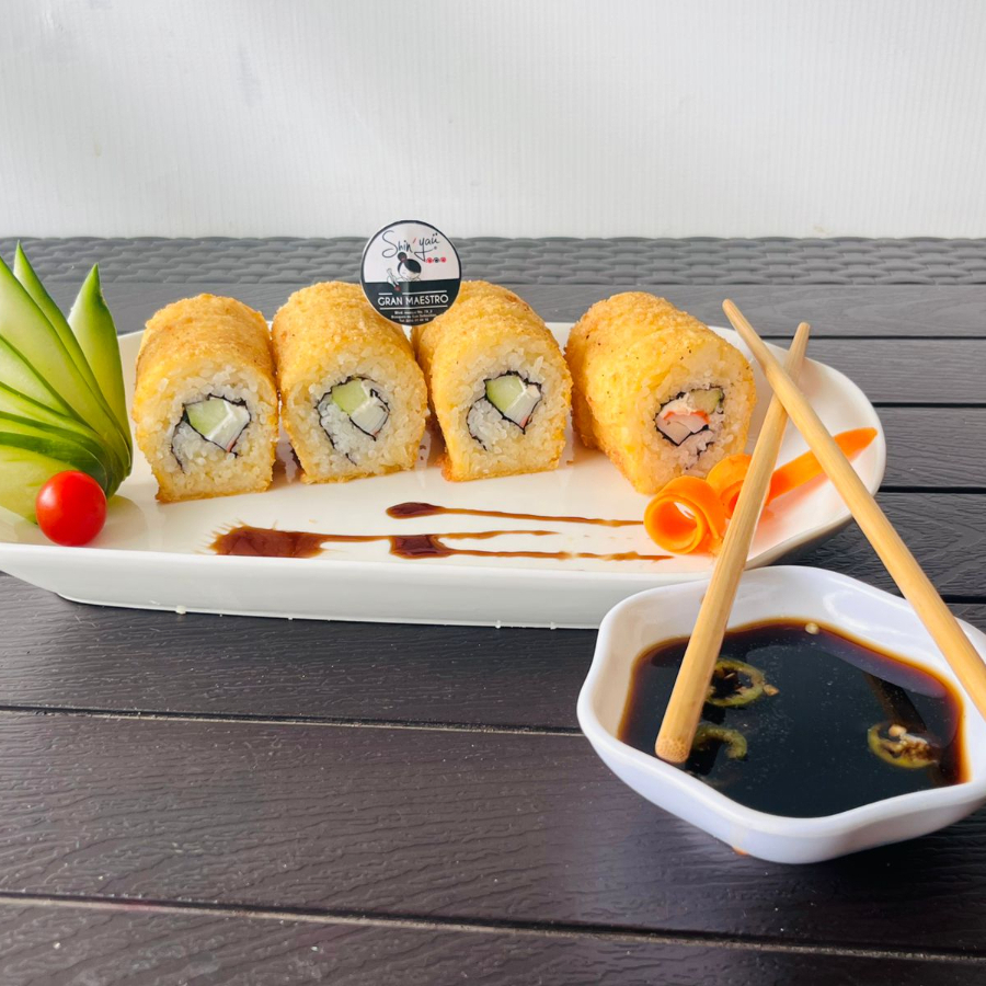 Relleno de camarón,pepino,aguacate,queso crema y salsa macha empanizado con panko