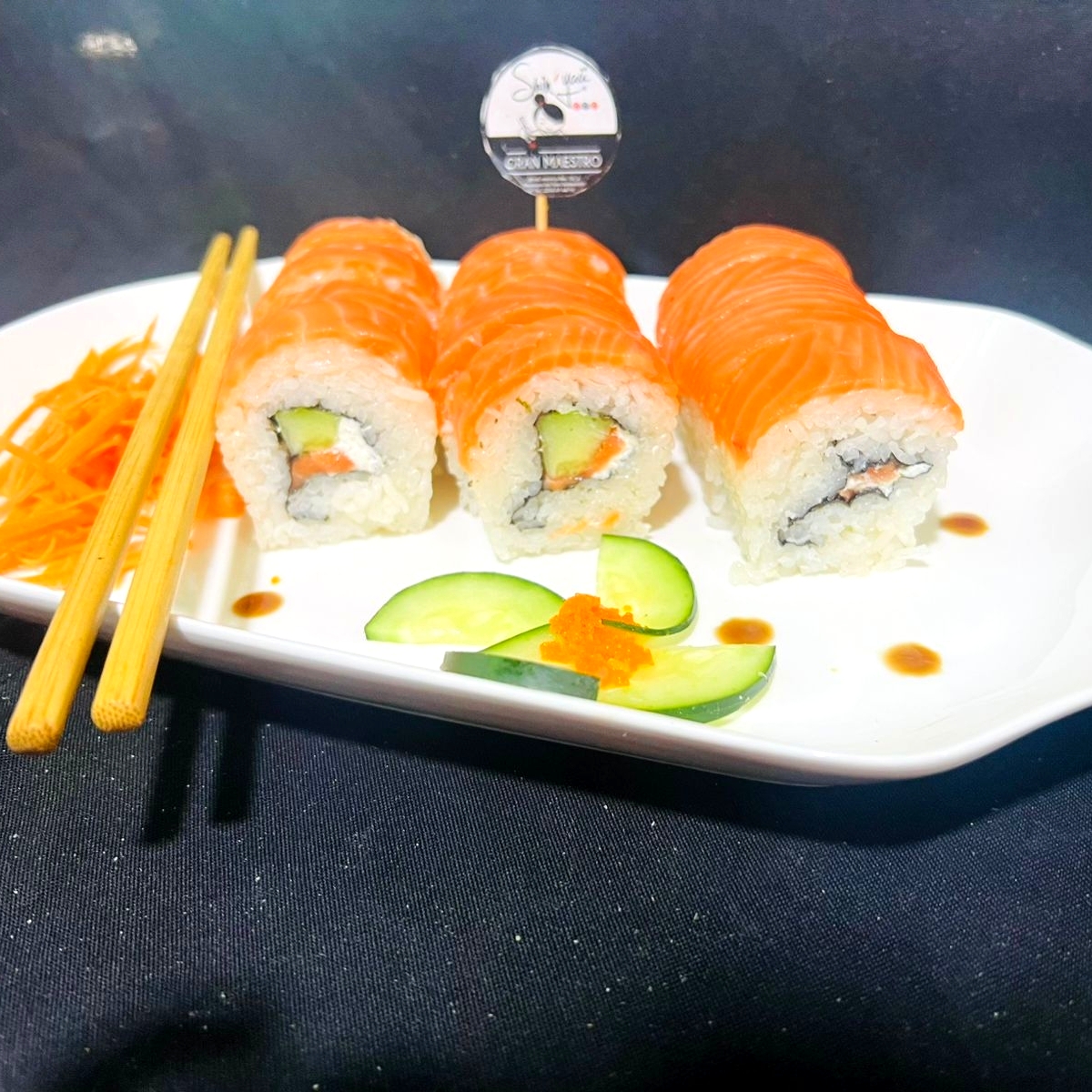 Relleno de de pepino, queso crema, salmón, aguacate abrazado de queso crema y cubierto de salmón