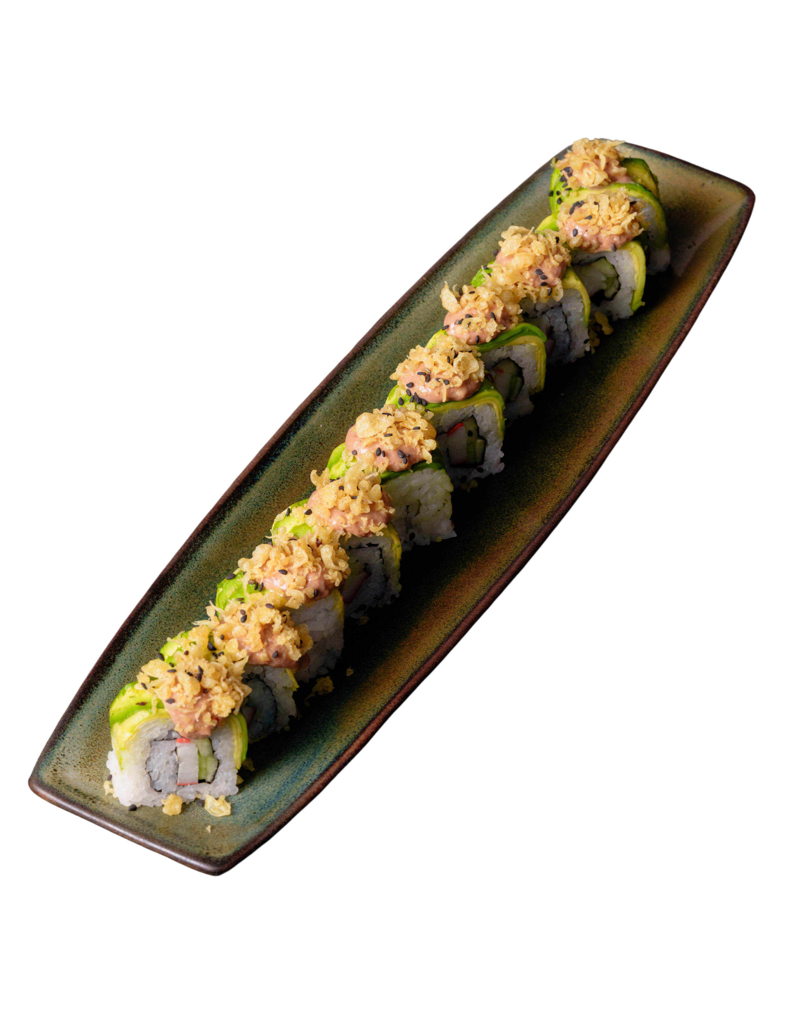 Relleno de pepino y surimi (25 g), cubierto con arroz shari y aguacate, coronado con mezcla de queso crema y salsa de anguila, pasta crocante y ajonjolí negro tostado.