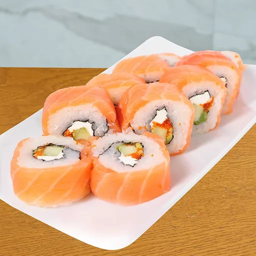 Relleno de salmón fresco (20 g), queso crema (20 g), aguacate y pepino, cubierto con arroz shari y masago (20 g) y coronado con aderezo jalapeño.