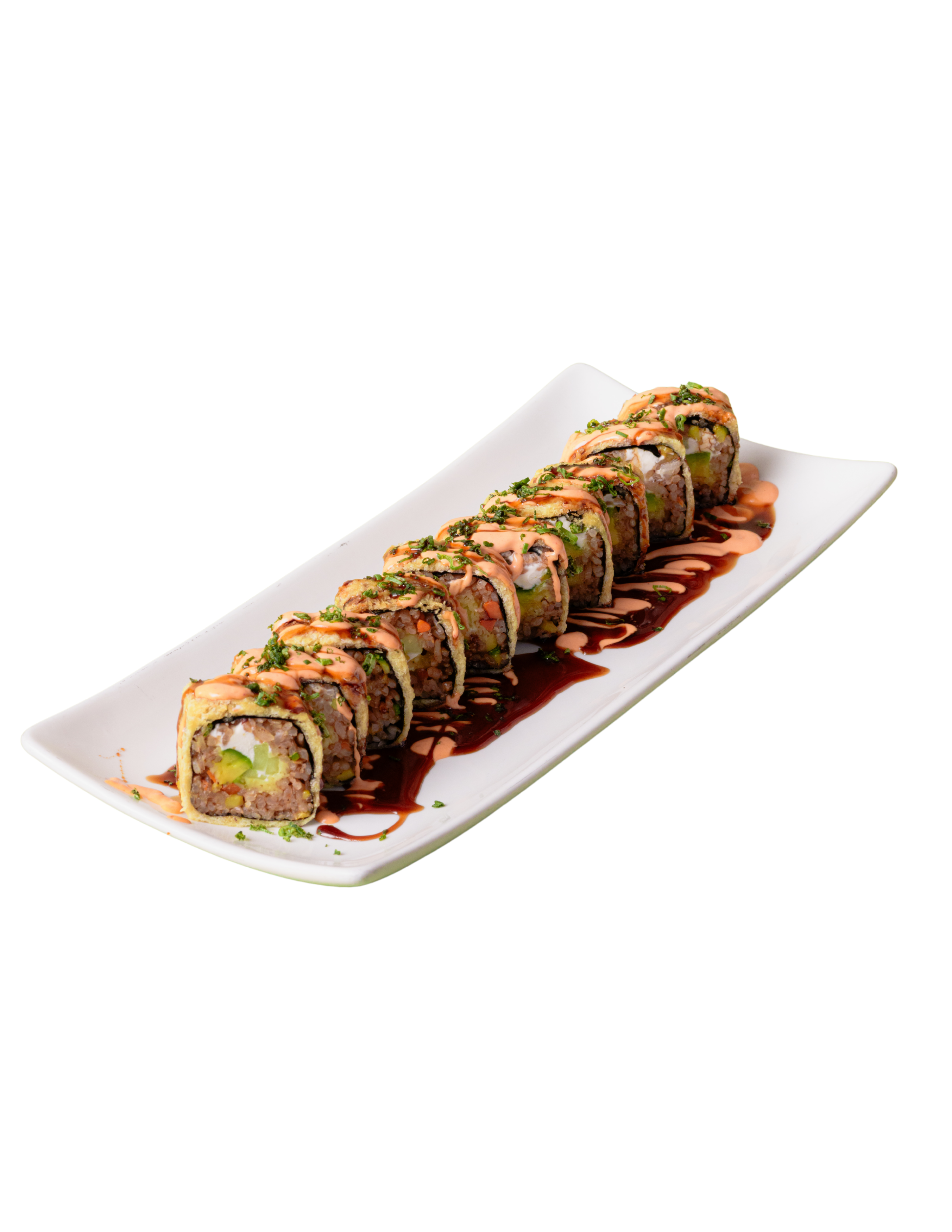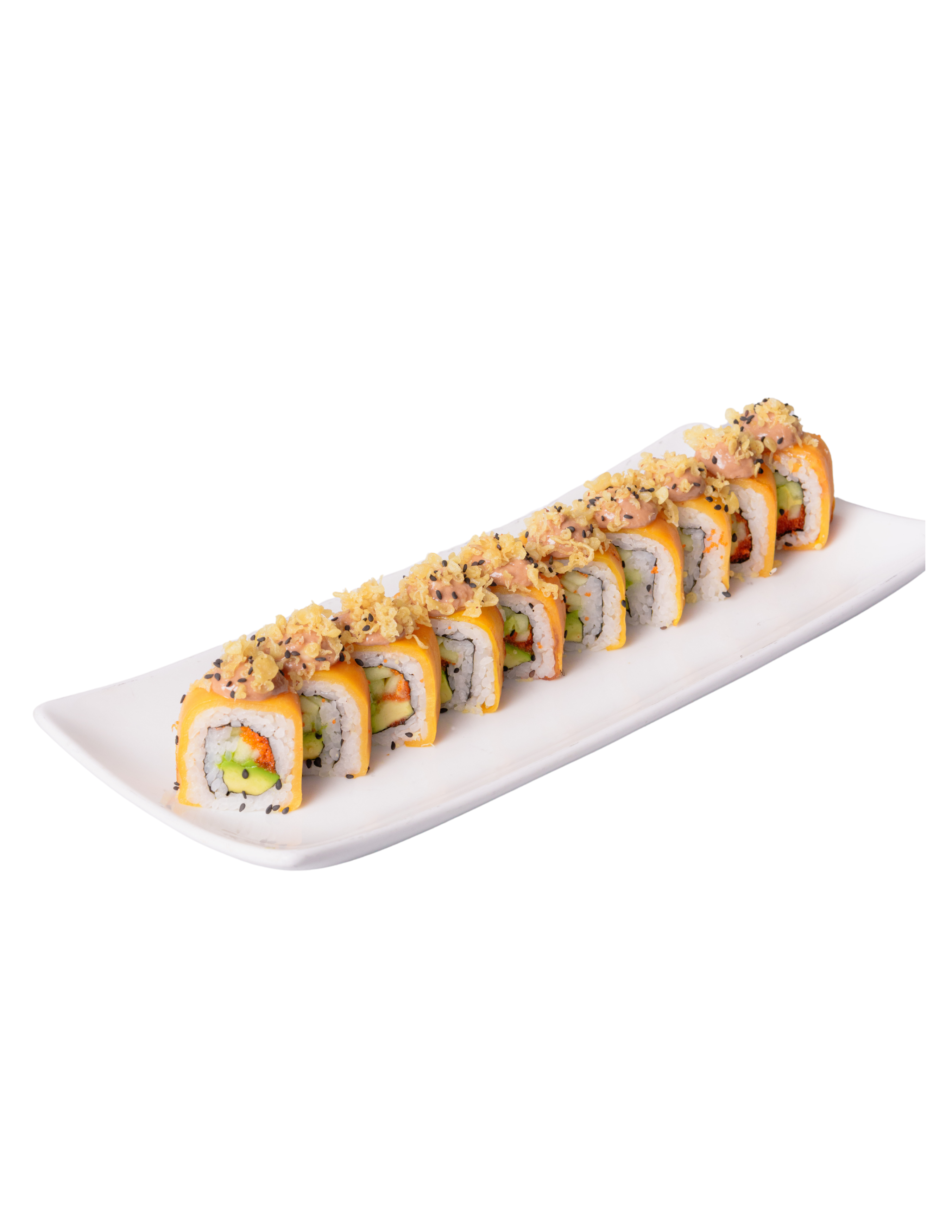 Relleno de aguacate, pepino y surimi (25 g), cubierto con arroz shari, queso crema (40 g) y con crujiente empanizado. Coronado con aderezo tampico (80 g) y salsa sriracha.