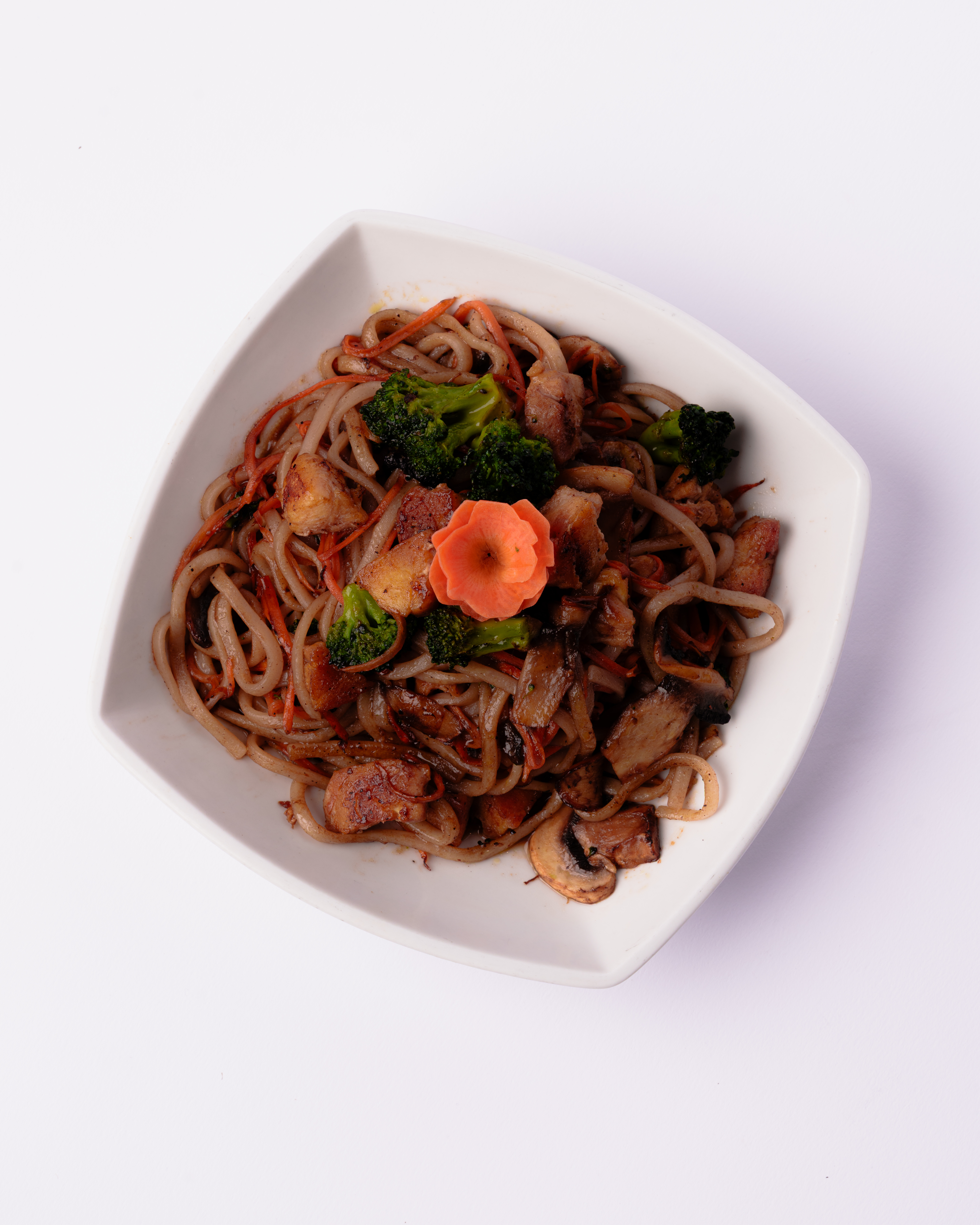 Fideos udon salteados con pollo (120 g), brócoli, champiñón, en salsa teriyaki. zanahoria y cebollín.