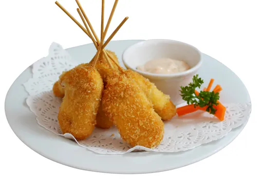 Brochetas crujientes de plátano macho relleno de queso gouda(50 g), empanizadas y acompañadas con aderezo de kushiage.