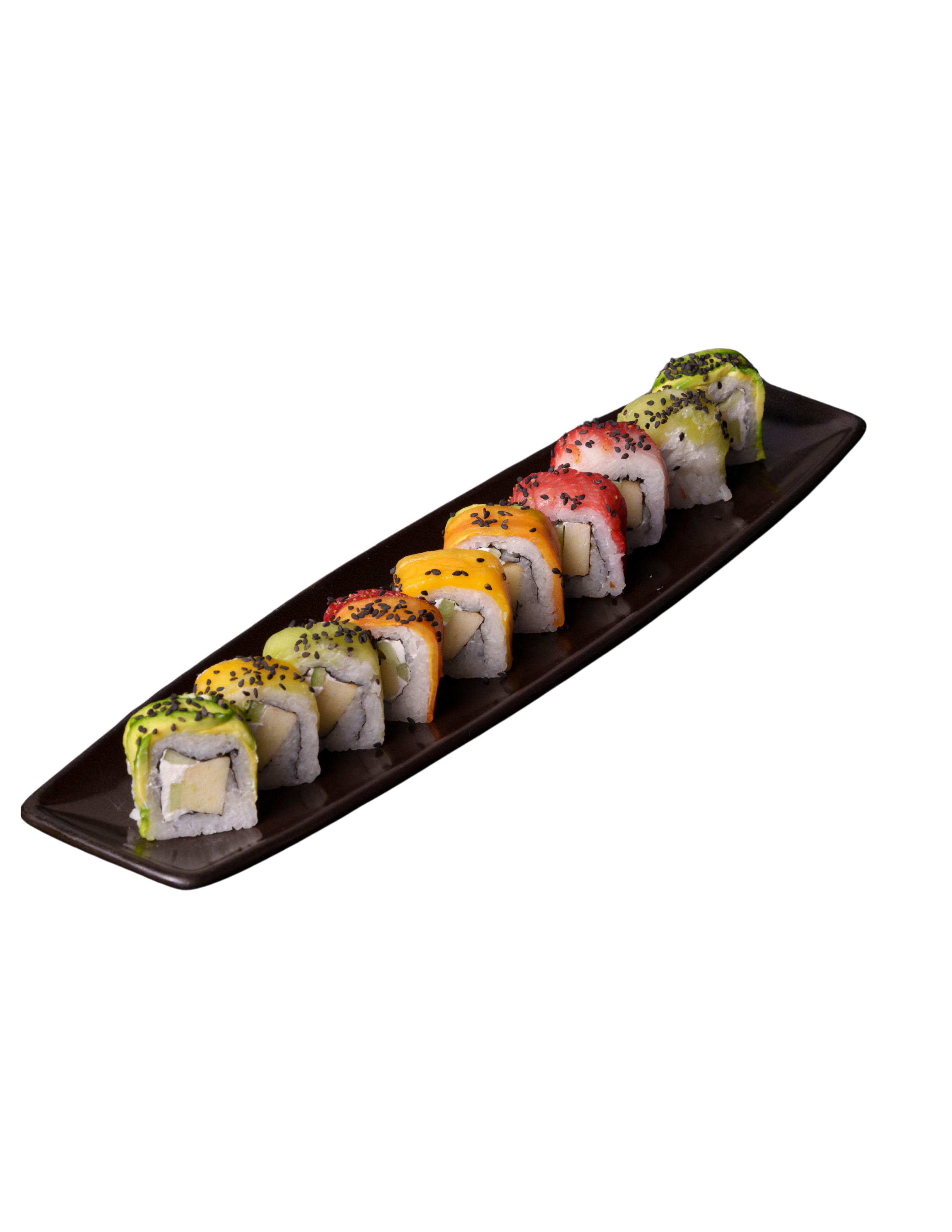 Relleno de aguacate, pepino, y surimi; cubierto arroz shari, queso crema (60 g) y ajonjolí blanco tostado.