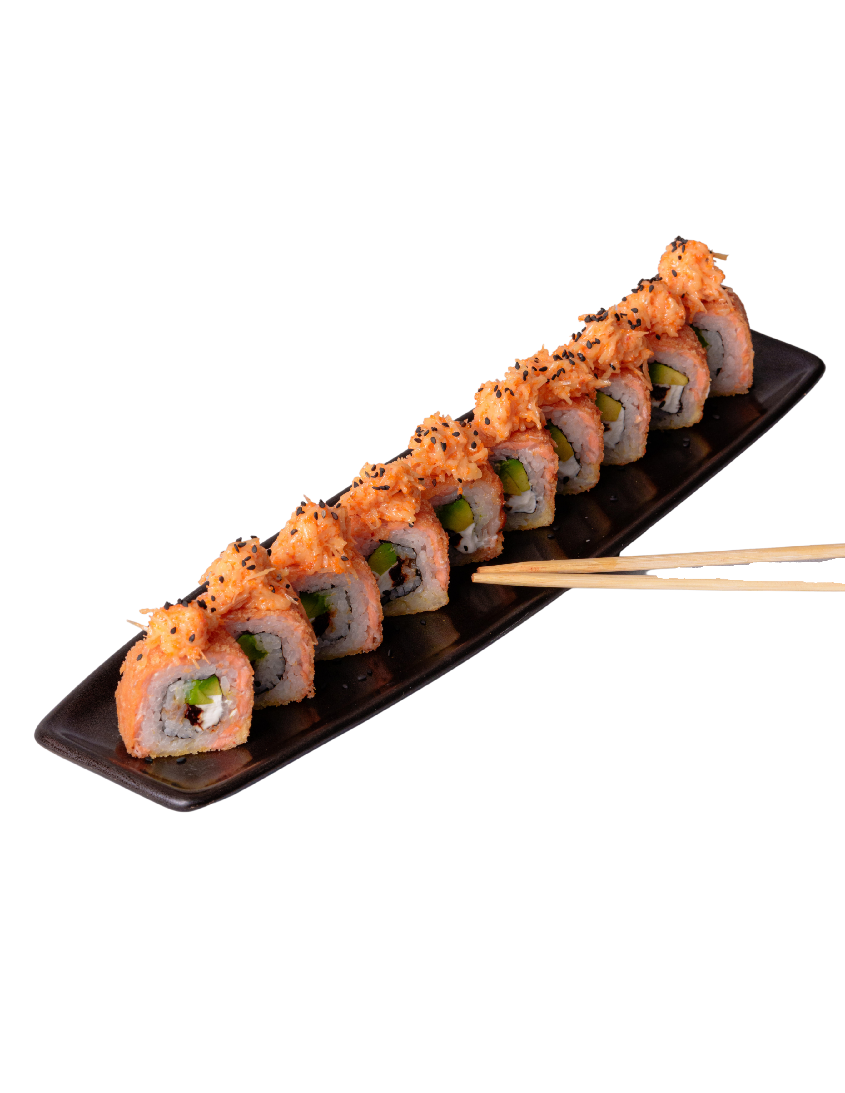 Relleno de chipotle, aguacate y queso crema (20 g), cubierto conarroz shari, salmón fresco (60 g) y crujiente empanizado y coronado con una mezcla de quesos, y masago (10 g) y aderezo spicy.