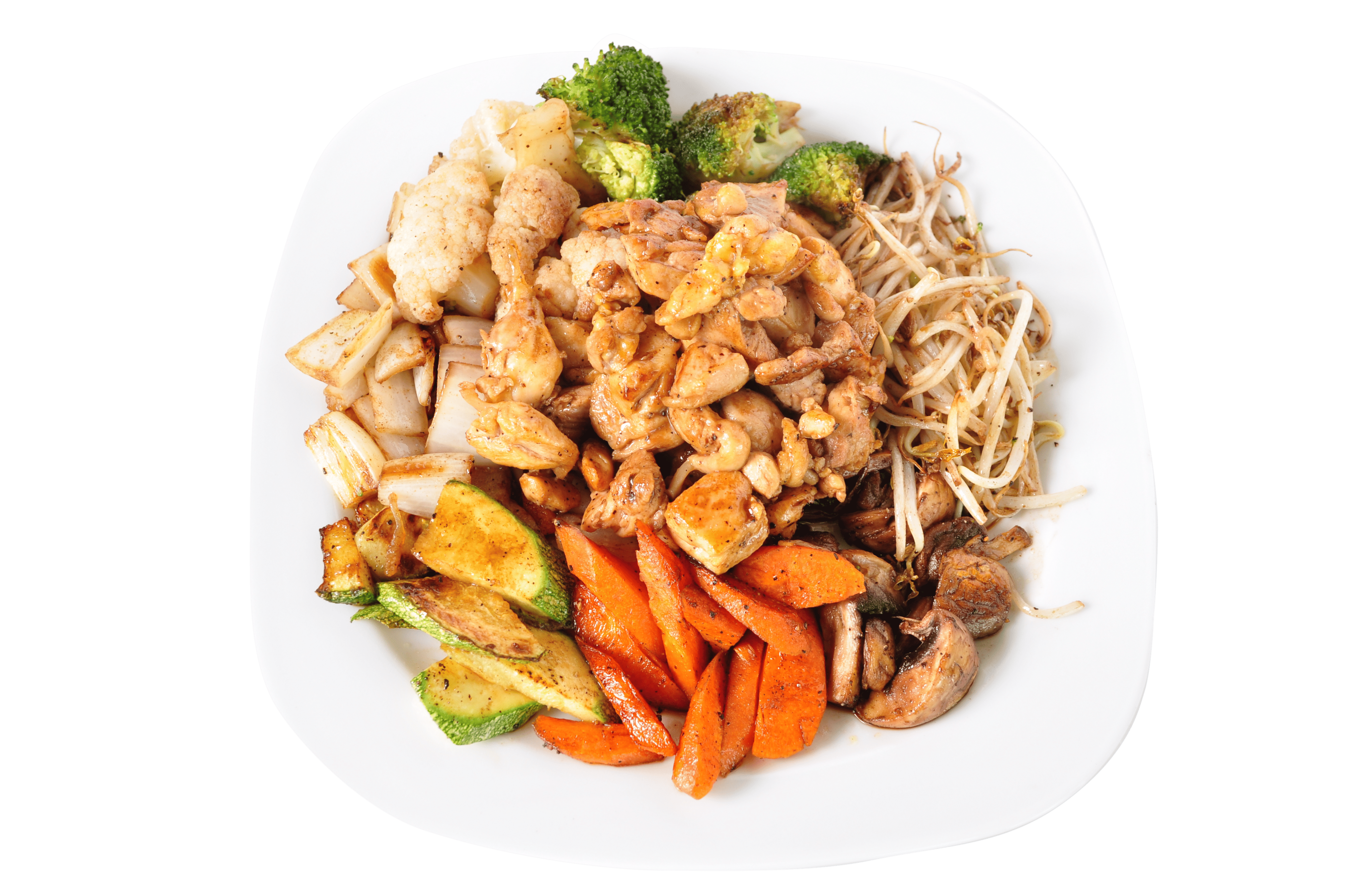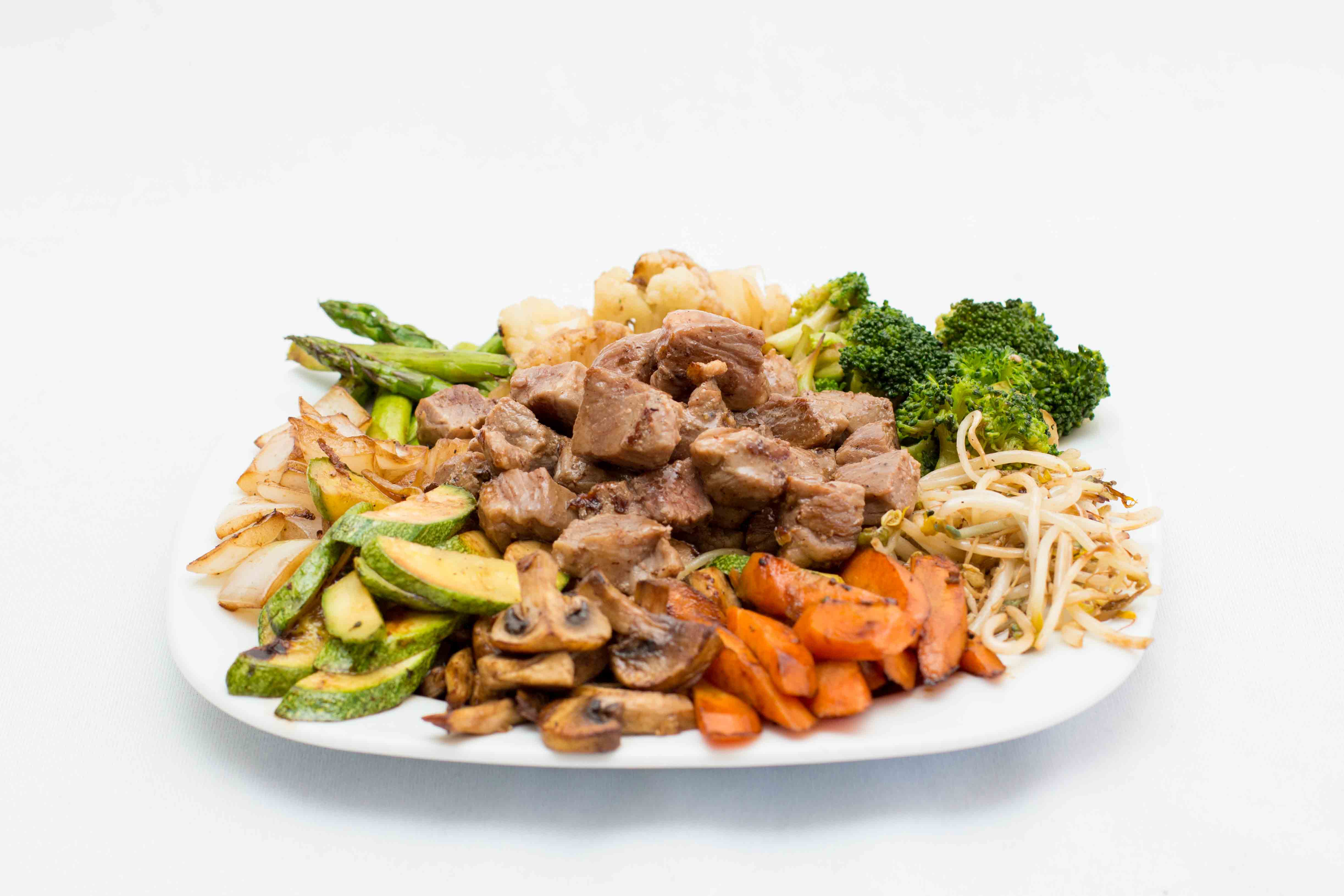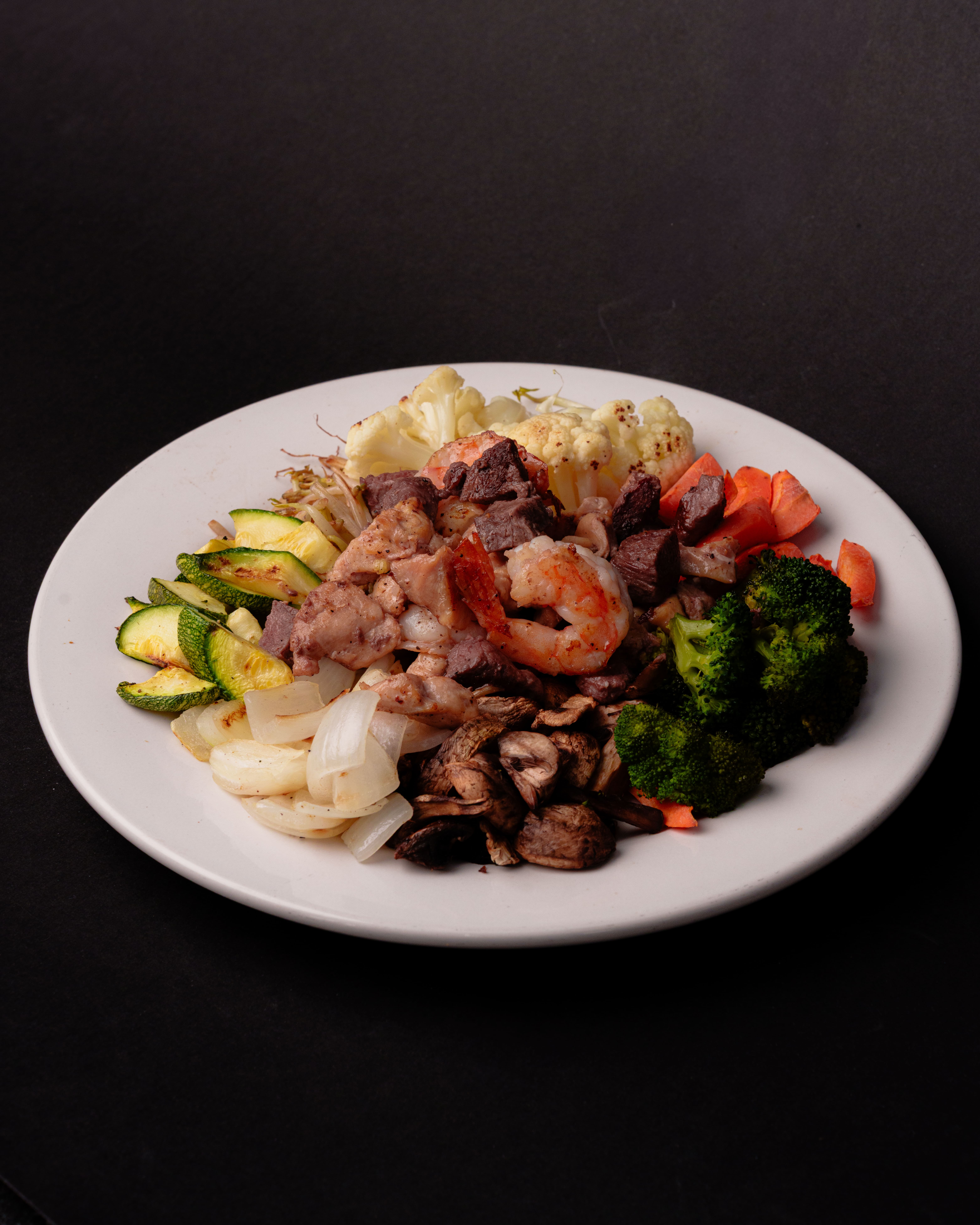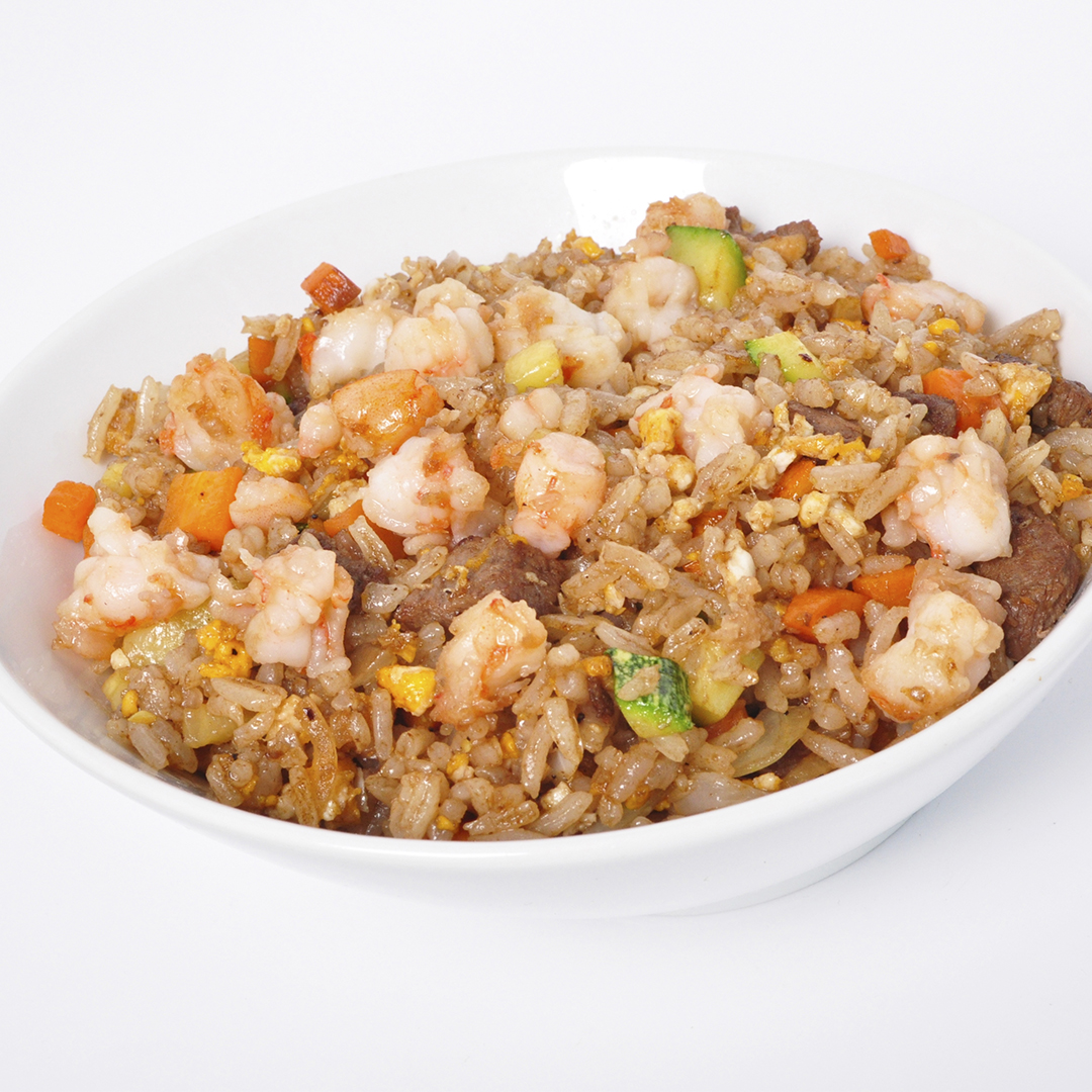 Trozos de pollo (60 g), filete de res (60 g) y camarón (60 g) a la planchacon combinación de vegetales frescos; germen de soya, calabaza, zanahoria, champiñón, cebolla, brócoli, coliflor, sazonados con salsa de soya.