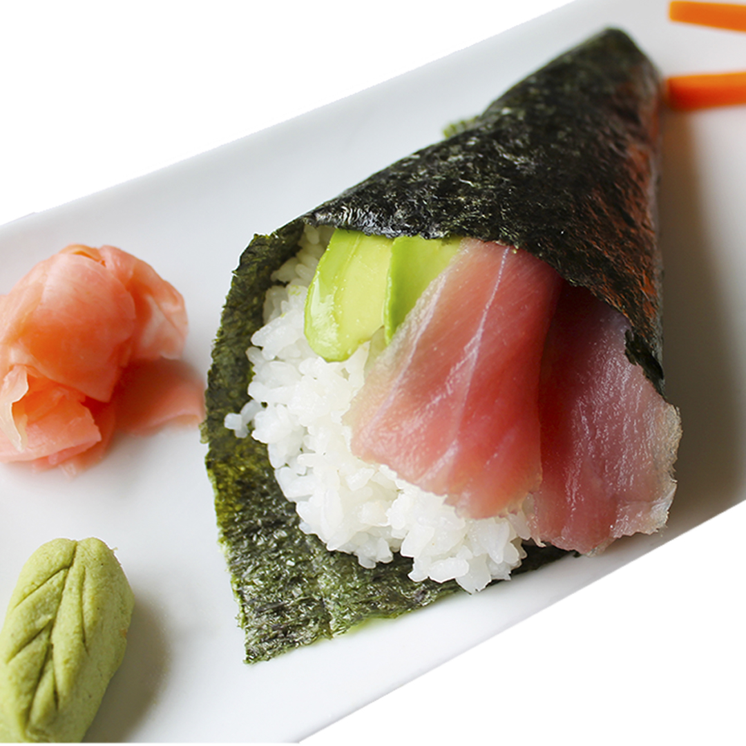 Alga nori rellena de arroz, queso crema (10 g), pepino, aguacate y atún fresco (20 g).
