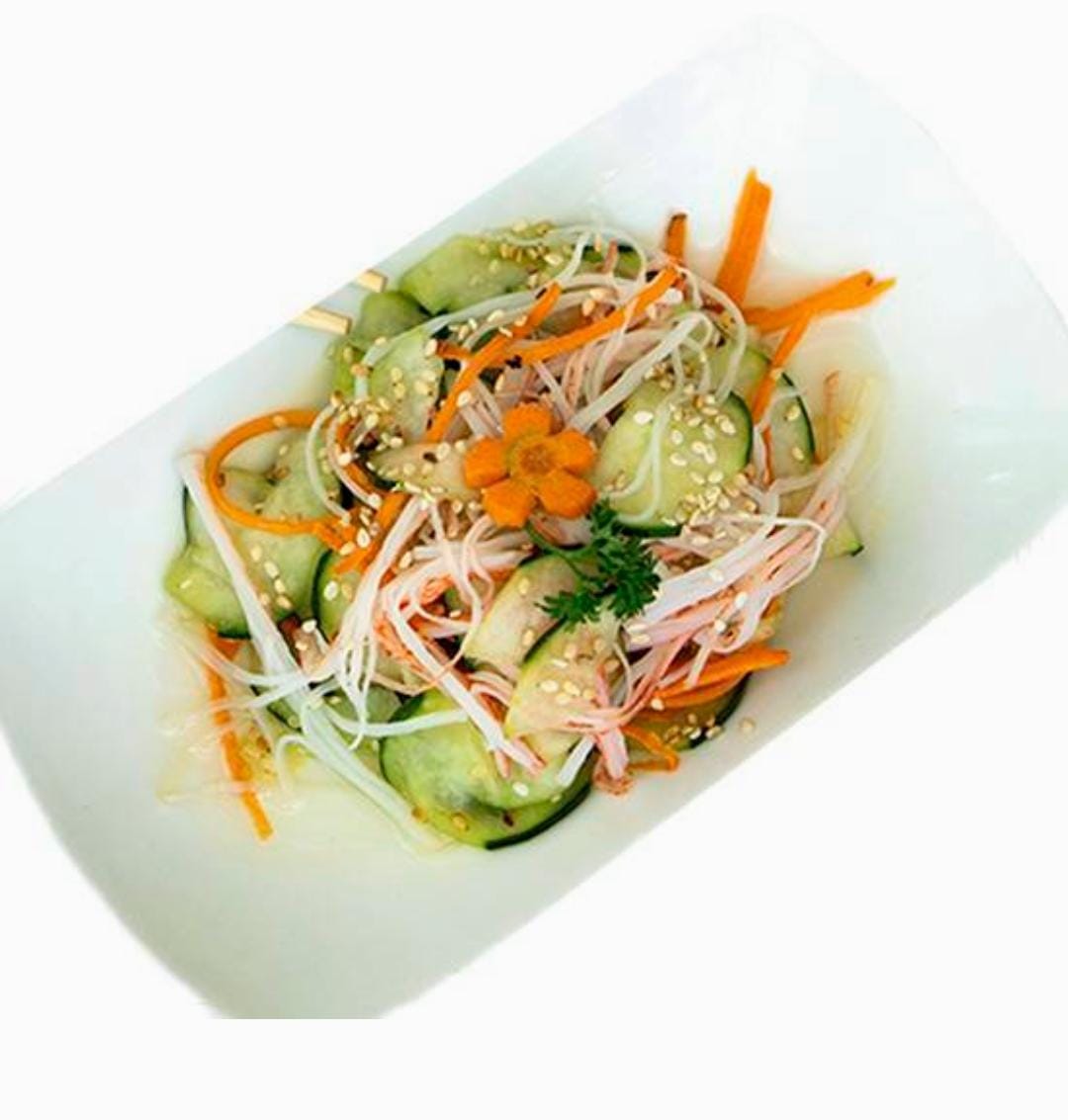 Ensalada fresca de pepino y zanahoria encurtidos, coronadacon kanikama (30 g; surimi sabor cangrejo) desmenuzado y ajonjolítostado.