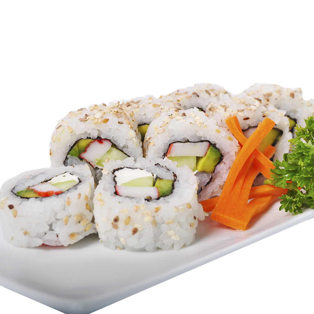 Relleno de queso crema (20 g), aguacate, pepino y surimi (25 g), cubierto de arroz shari y ajonjolí blanco tostado.