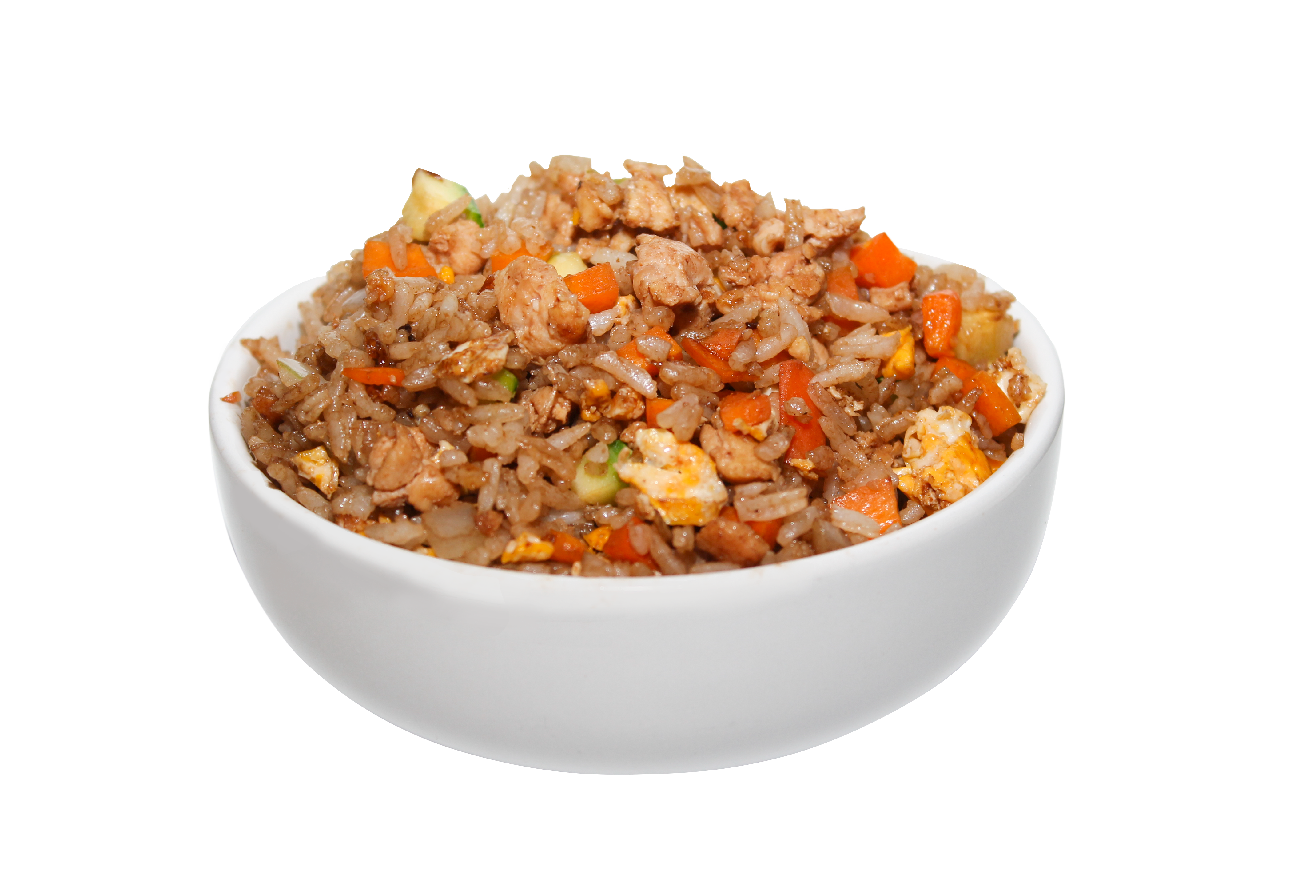 Arroz a la plancha con calabaza, cebolla, zanahoria, pollo (90 g), huevo y salsa de soya.