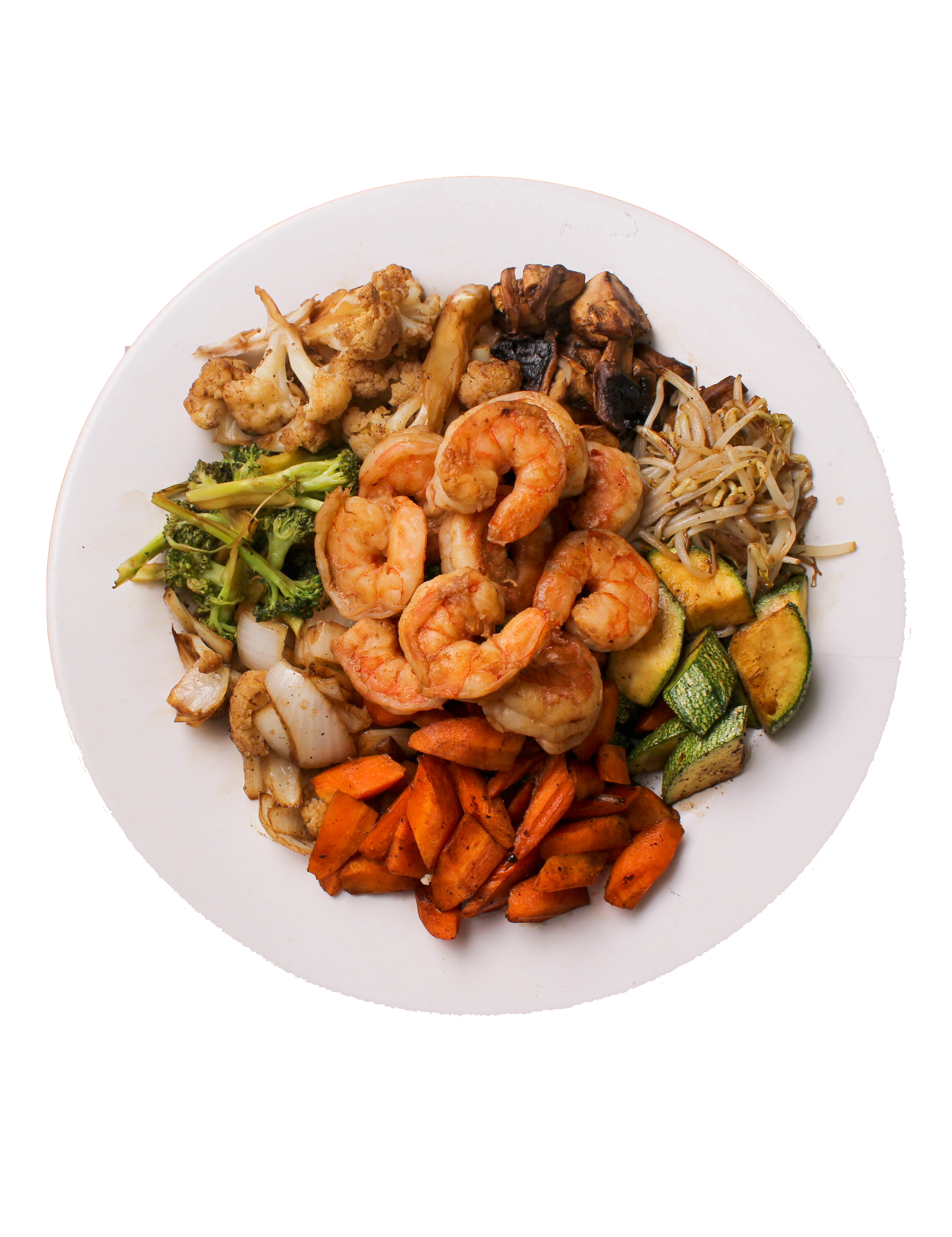 Camarones a la plancha (150 g), con combinación de vegetales frescos;germen de soya, calabaza, zanahoria, champiñón, cebolla, brócoli y coliflor, sazonados con salsa de soya.