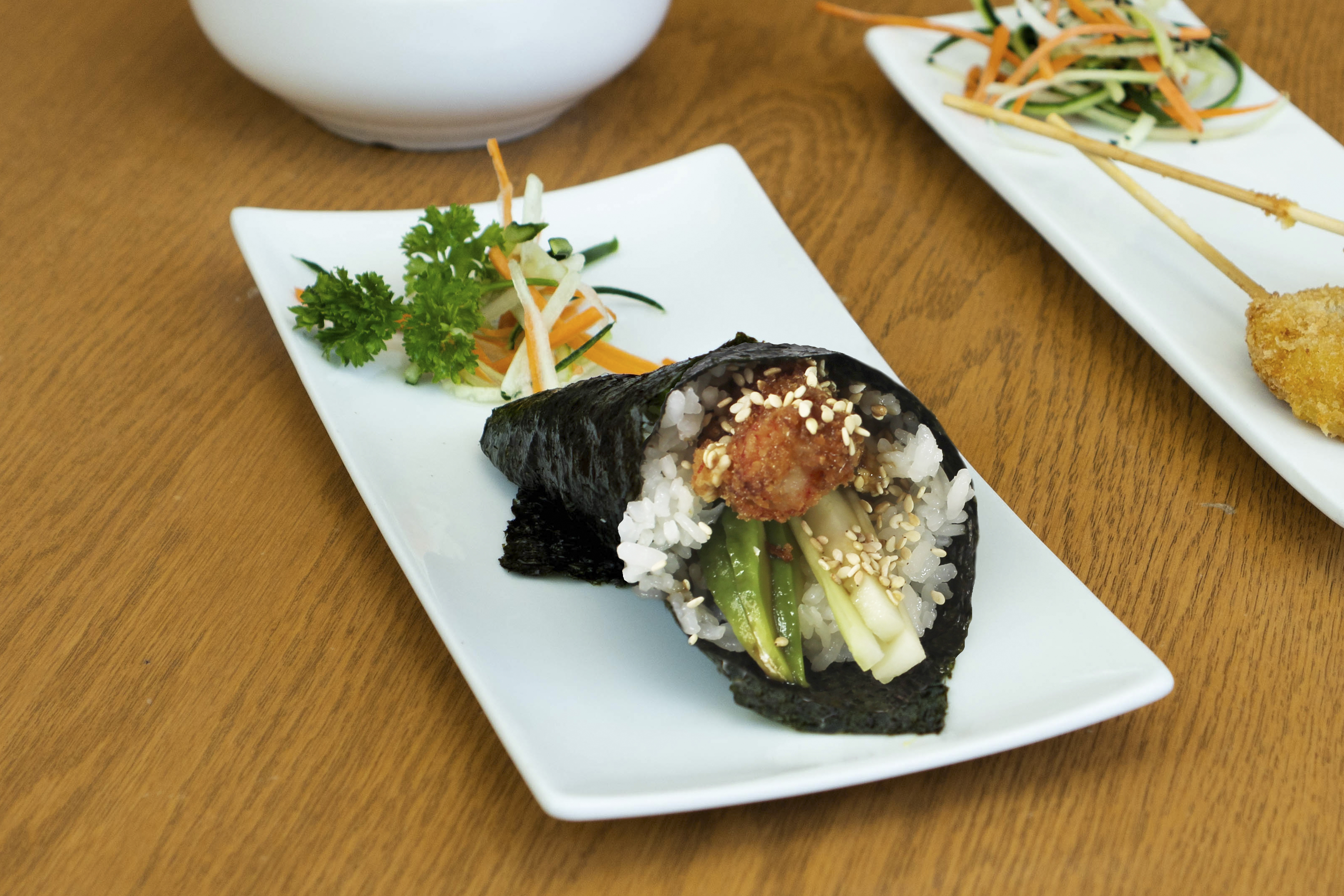 Relleno de queso crema (20 g), pepino y manzana, cubierto con arroz shari y fruta de temporada.