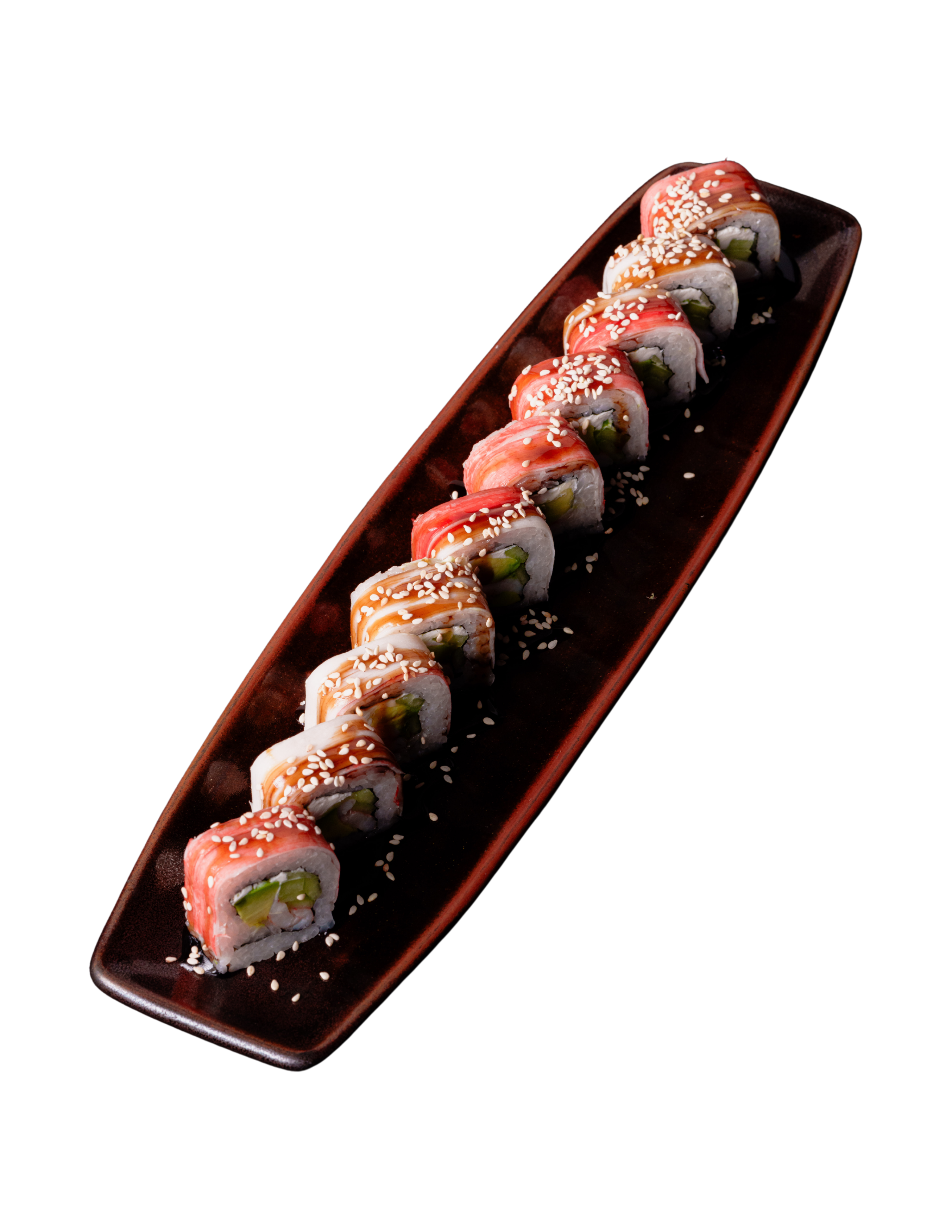 Relleno de queso crema (20 g), aguacate, pepino y camarón (20g), cubierto con arroz shari y kanikama (30 g) bañado en salsade anguila y ajonjolí blanco tostado.