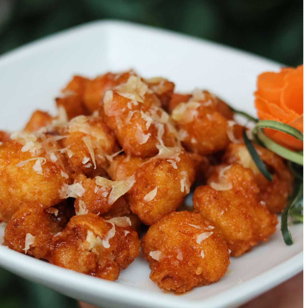 Crujientes bocados de coliflor empanizada con tempura y panko,bañados en salsa spicy hot y coronados con queso parmesano (15 g).